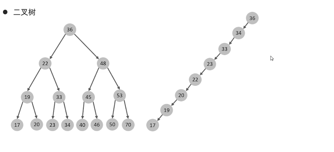 ① 二叉树缺点:顺序插入时,会形成一个链表,查询性能大大降低。大数据量情况下,层级较深,检索速度慢。而二叉树的缺点可以用红黑树来解决: