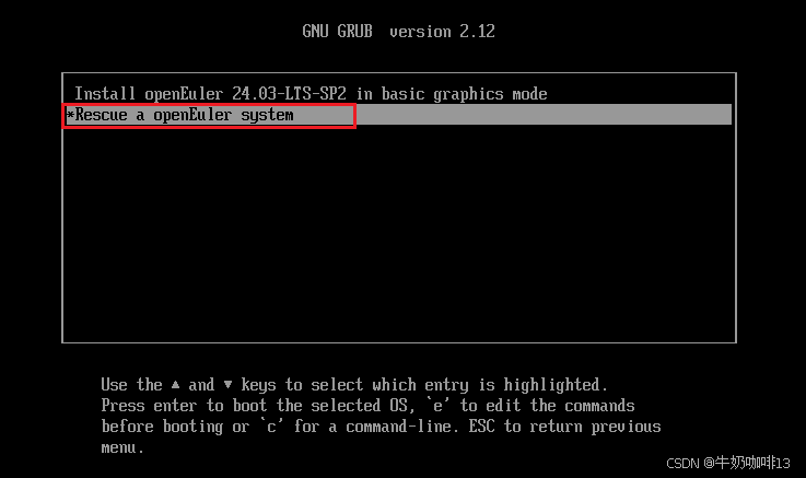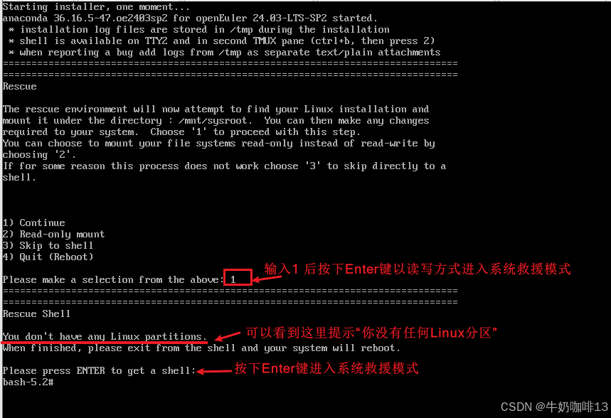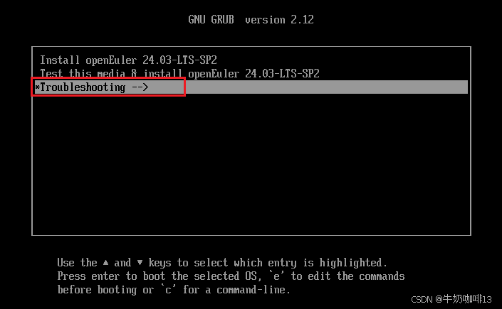 既然系统无法正常启动,一直卡住,没办法进一步分析操作;那么就借助系统盘(或系统用启动U盘且配有该系统的系统镜像)来进入系统救援模式【在主机上插入系统启动U盘,并将U盘设置为第一启动项后启动,选择【Troubleshooting】按下Enter键后-->选择【Rescue a openEuler system】按下Enter键即准备进入系统救援模式-->【输入1】后按下Enter键以读写方式进入系统救援模式】。