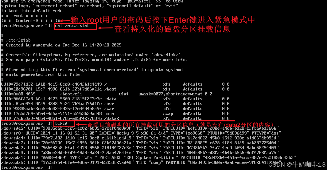 《2》接着我们输入root用户的密码进入系统中查看持久化【/etc/fstab】中的挂载分区内容;