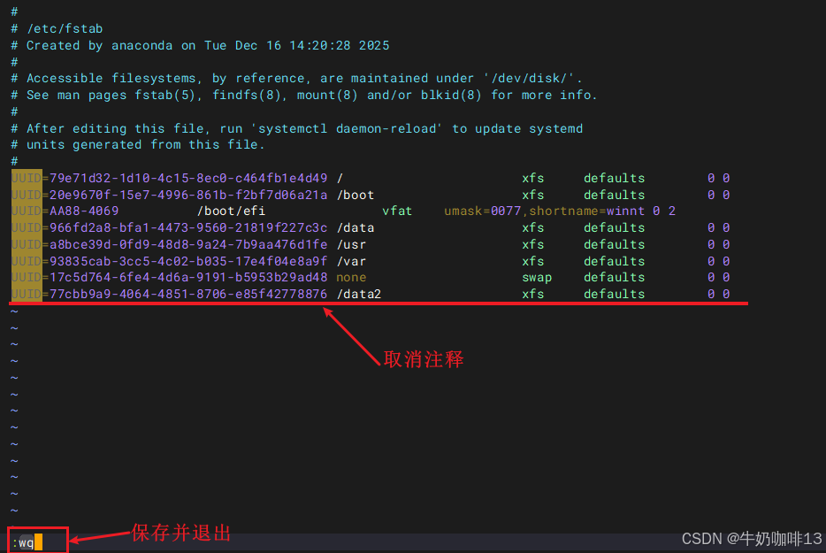 UUID=77cbb9a9-4064-4851-8706-e85f42778876 /data2 xfs defaults 0 0