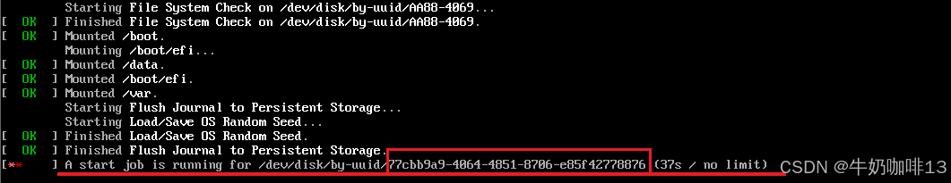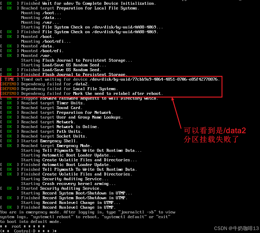 系统启动没有正常进入系统里面,而是进入紧急模式(You are in emergency mode),如下图所示: