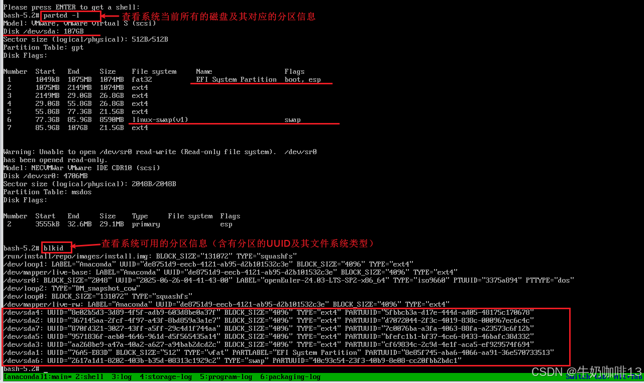 《2》执行【blkid】查看系统所有可用的分区信息(包含分区的UUID及其文件系统类型【在这里其实可以确定/boot/efi与swap】)。