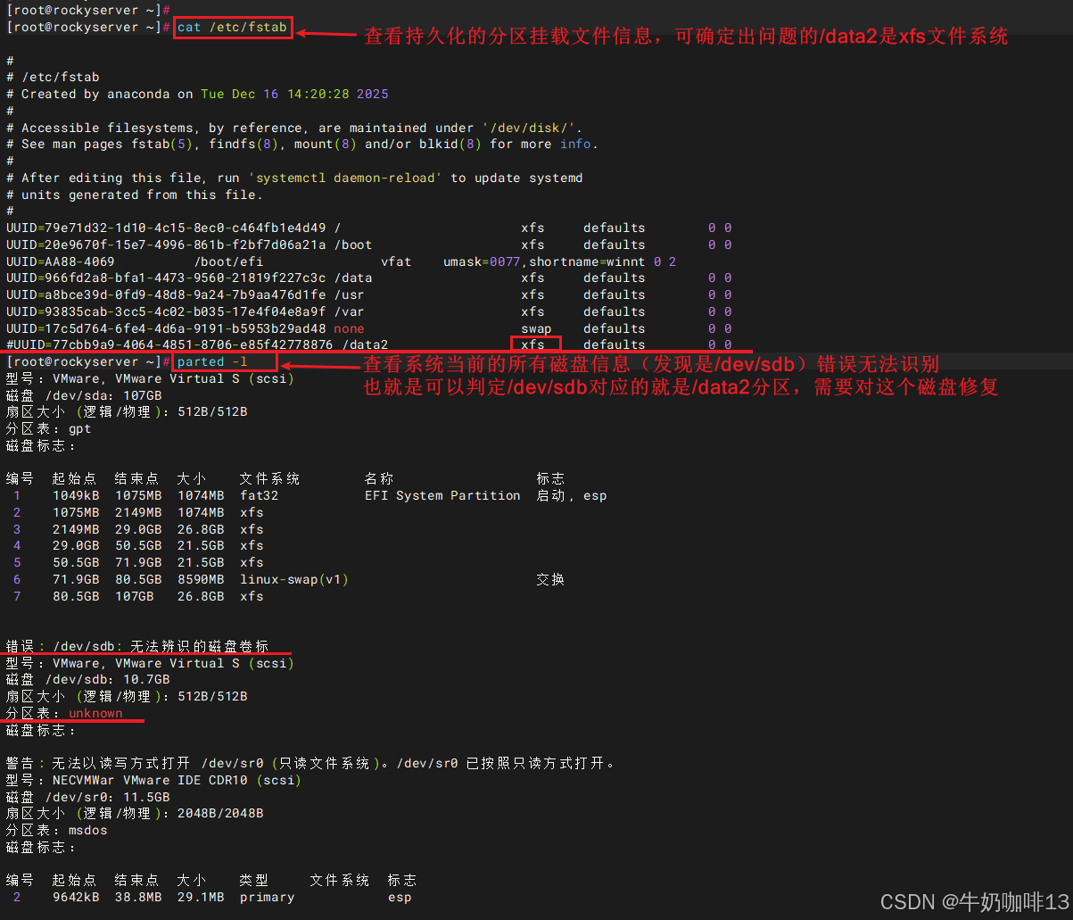 《4》接着在查看本机的所有磁盘情况【parted -l】可以看到有两块磁盘【/dev/sda】【/dev/sdb】两者对照就可以判断出是这个【/dev/sdb】的磁盘出问题了,系统的分区内容都是正常的(既然系统是正常的,那么我们可以先将有问题的/data2对应的持久化内容先注释【vi /etc/fstab】并重启【reboot】;
