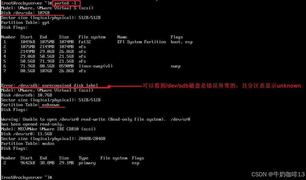 《1》执行【parted -l】查看系统所有的磁盘及其分区情况。