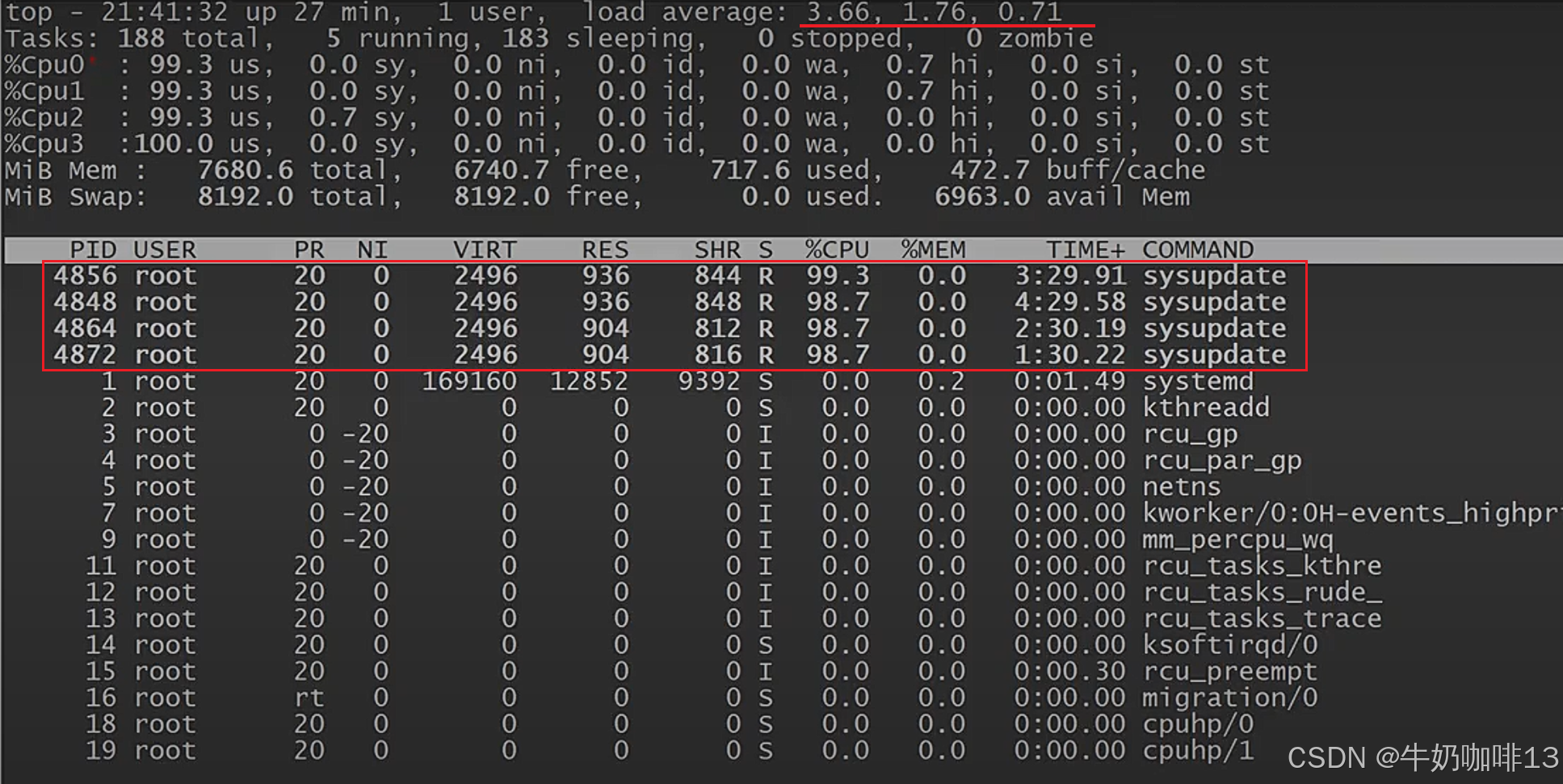 使用【top】命令查看系统的占用率,发现前四个进程的CPU使用率都高达98%及其以上,如下图所示: