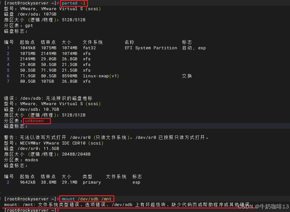 《5》重启正常进入系统后尝试挂载这个有问题的磁盘【/dev/sdb】显示"文件系统类型错误、选项错误、/dev/sdb 上有坏超级块、缺少代码页或帮助程序或其他错误."也就是说这个磁盘出问题了,还有就是使用【parted -l】查看所有磁盘信息时分区表显示【unknown】时,考虑到该磁盘有数据内容,不能随意格式化,那么我们可以尝试修复该磁盘看看),如下图所示: