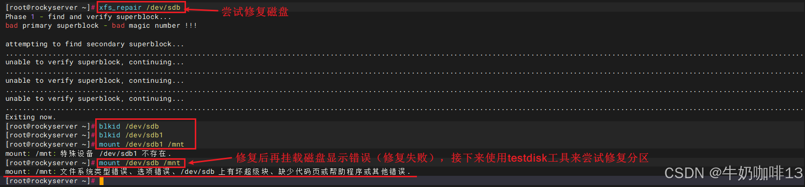 根据查看到的故障磁盘分区是xfs文件系统的,因此可以尝试使用【xfs_repair /dev/sdb】修复。而ext4文件系统则使用【fsck -y /dev/sdb】命令修复(一般来说执行修复命令后大部分都可以修复成功后挂载上即可。但是也有修复不成功的情况,可先使用【Testdisk】修复分区(若恢复后数都有,但数据名称显示不对,可以使用rlinux进行恢复数据),最后就需要使用数据恢复工具尝试恢复数据了)。