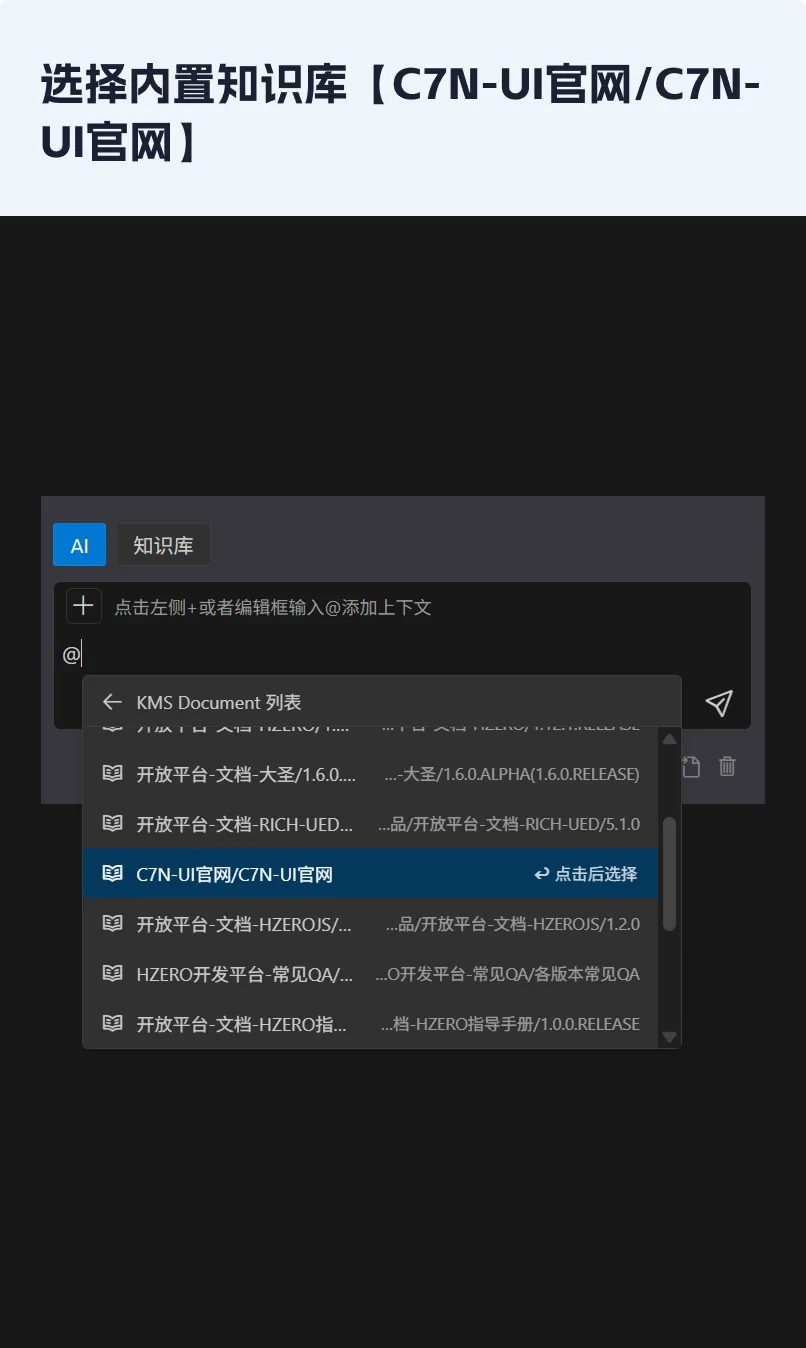 选择内置 C7N-UI 官网知识库,结合本地上下文与企业私有知识库进行智能问答。飞码将自动匹配相关知识片段,并支持人工复核检索结果,使生成的代码更符合企业规范与实际业务需求