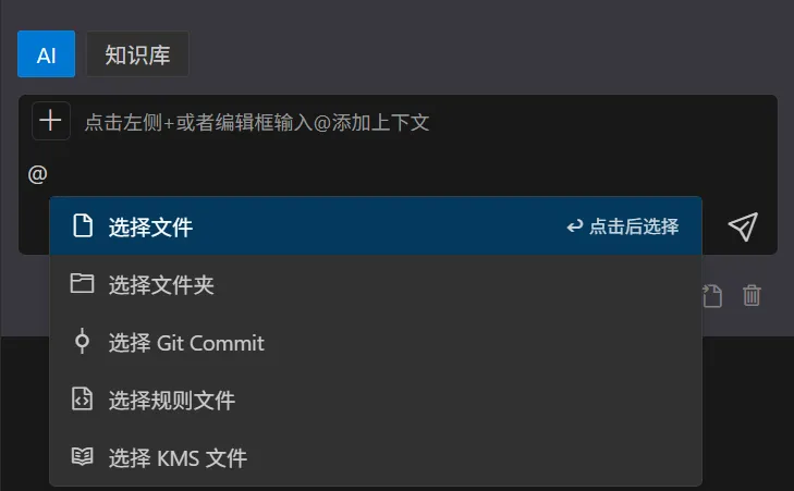 在插件会话中,可通过点击「+」按钮或输入「@」符号快速唤起上下文选择,同时支持文件、文件夹、 Git 提交记录、规则文件以及 KMS-Docs 等多种上下文类型