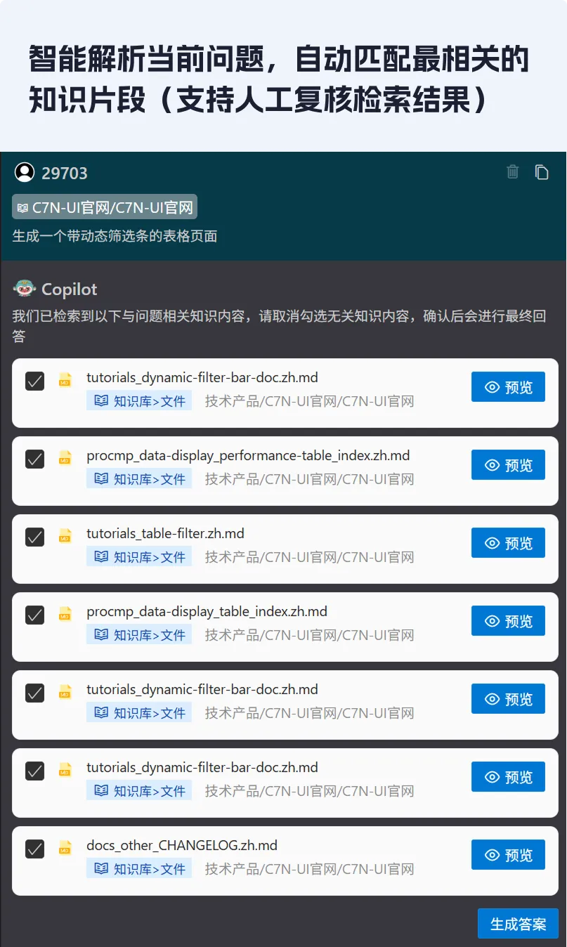 支持手动筛选、过滤、预览知识库片段,精准控制问答质量
