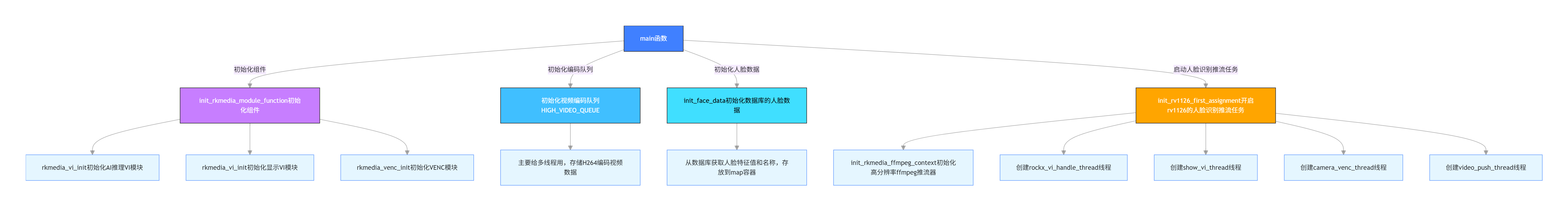 上图展示了RV1126+Rockx人脸识别推流系统的整体架构框图。该系统首先需要初始化核心模块和队列容器:模块部分包含两个VI模块,其中第一个VI模块负责基于Rockx框架的人脸检测与识别AI推理,第二个VI模块用于显示推理结果;容器部分包括Map容器(用于存储人脸特征数据库)和视频编码队列。