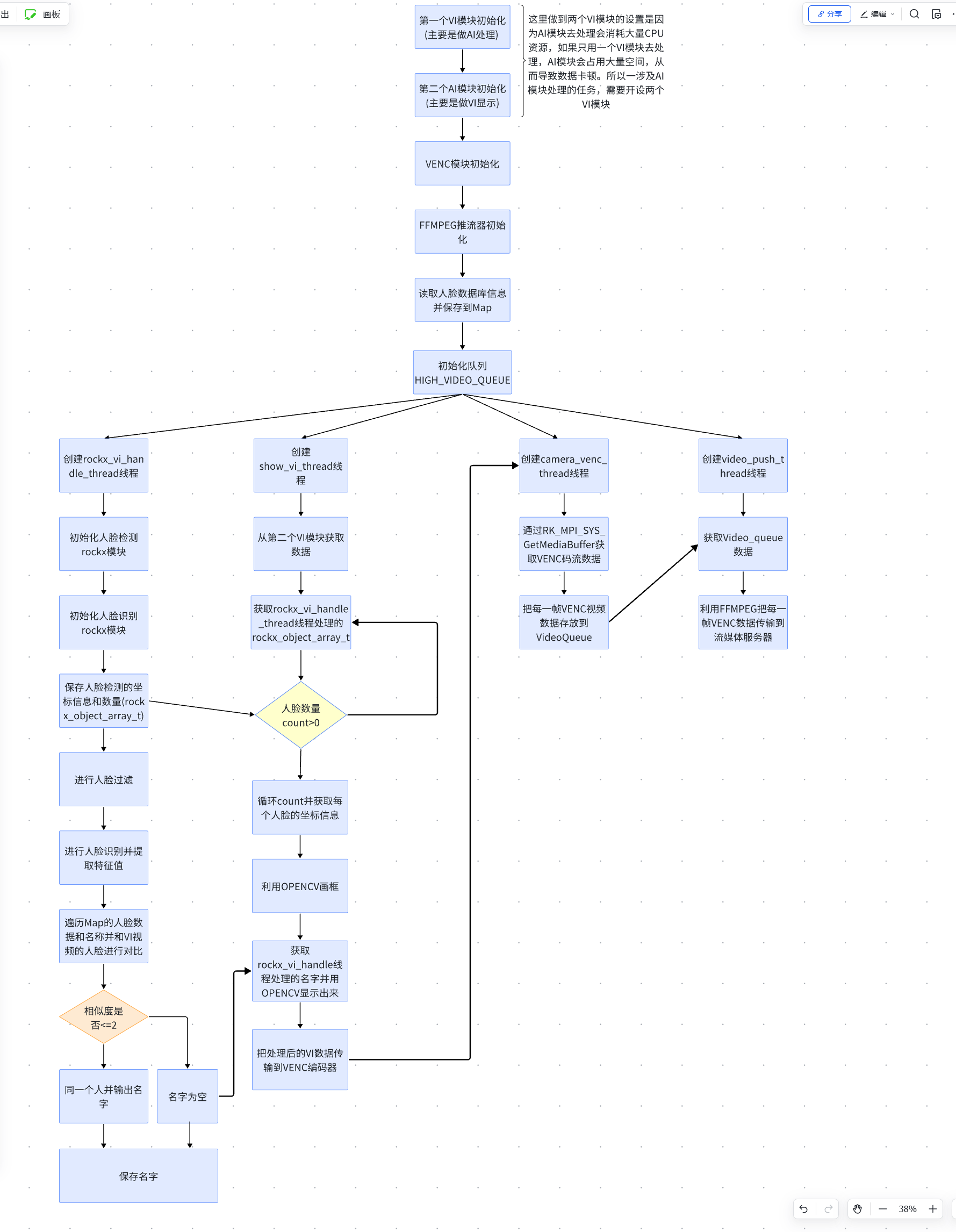 rockx_vi_handle_thread线程:从第一个VI模块获取视频数据,利用Rockx框架进行人脸检测与识别。该线程会先对人脸数据进行过滤处理,随后提取人脸特征值并与数据库进行比对(相似度阈值设为1.2),识别成功后输出对应人员姓名。