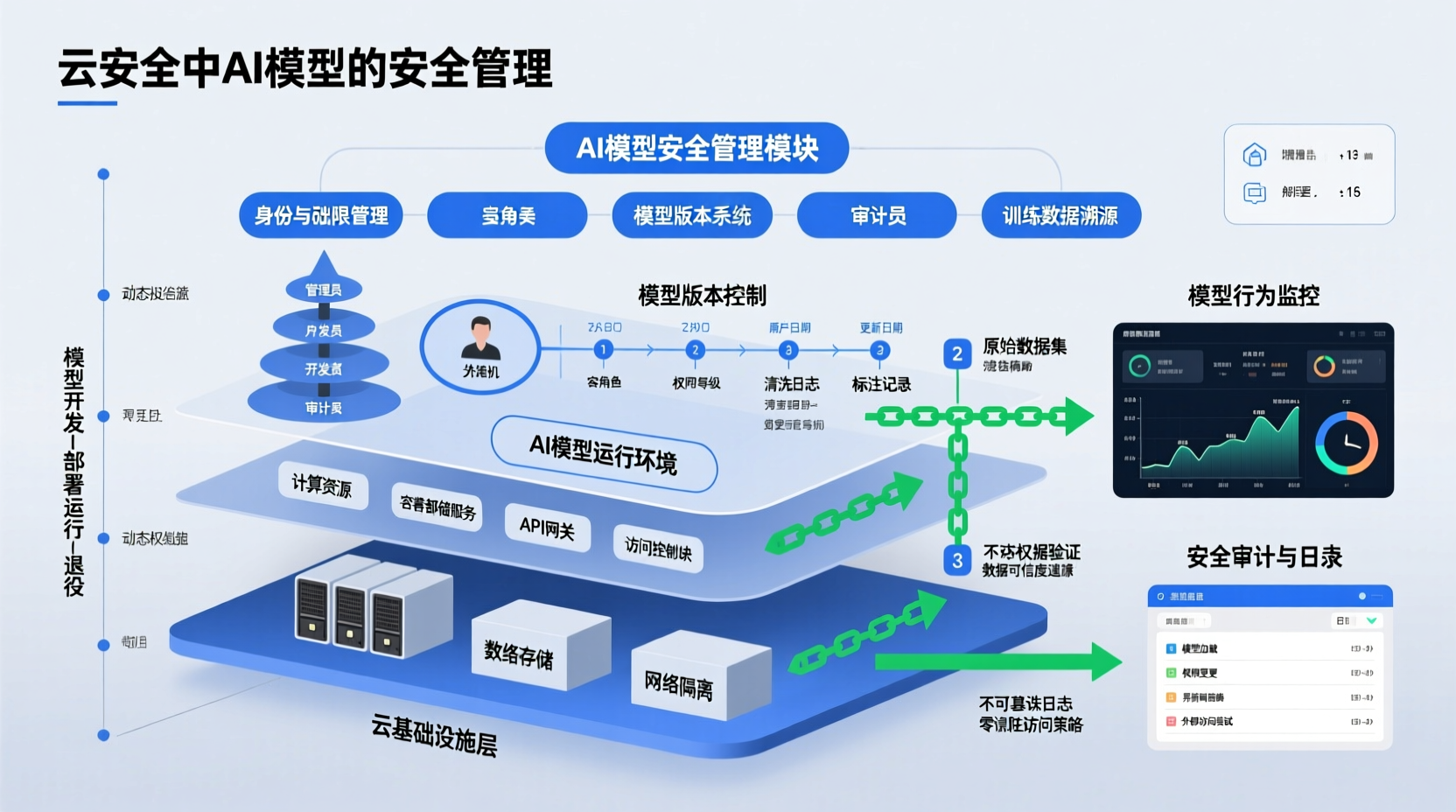 云环境中AI模型的安全管理需要从"以代码为中心"转向"以模型和数据为中心"的防护范式。核心在于将安全控制嵌入模型全生命周期:开发阶段通过数据治理和训练隔离降低内生风险,部署阶段采用加密、访问控制和输入过滤构建纵深防御,运行阶段依靠持续监控实现快速响应。