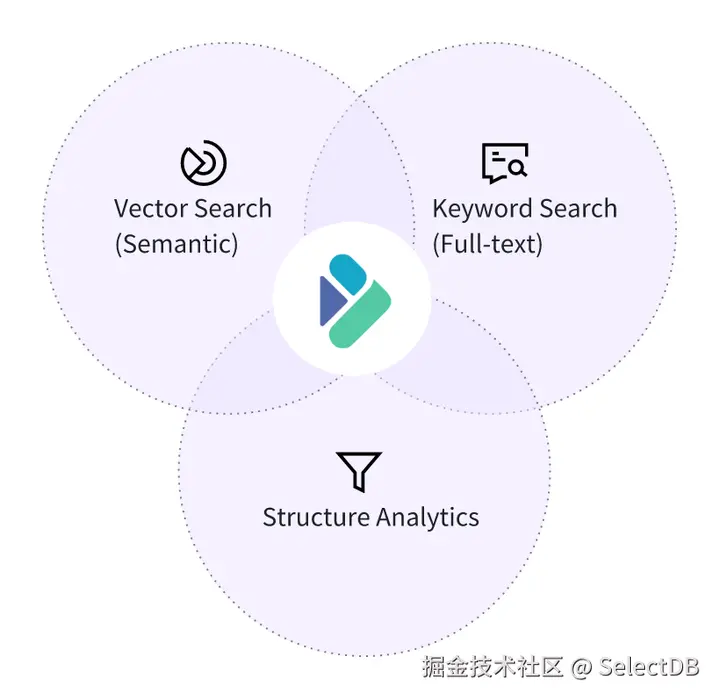 这一根本性变化,对数据库的检索能力提出了全新挑战。传统单一的搜索模式(无论是关键词还是向量搜索)已显不足,在应对复杂多模态的 Agent 查询时,往往在缺乏结果的全面性、语义的精确性以及流程的可控性。而这就要求数据库同时具备三种能力,将结构化分析、文本搜索和向量语义搜索集为一体,实现高效的混合搜索能力。特别是在以检索增强生成(RAG)为代表的应用中,混合搜索能力变得更为关键,已成为避免幻觉、提高相关性与保持实时性的基础能力。