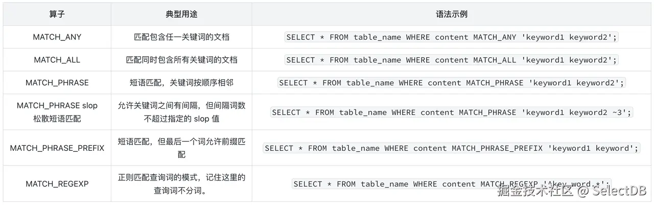 - 丰富的查询算子:在倒排索引的基础上,Doris 实现了完整的搜索算子体系,完整可见下图: