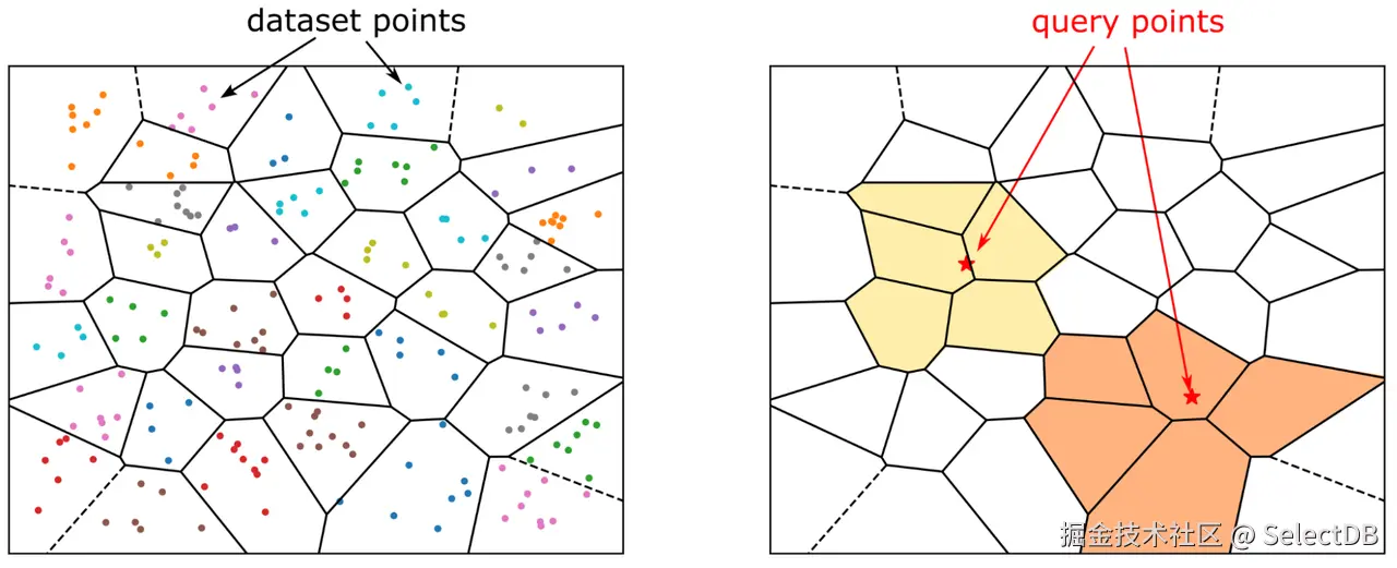 - IVF(Inverted File Index)通过聚类(如 k-means)将向量划分到不同分桶,仅在最相关的分桶中进行搜索。其构建速度快、资源占用低,适合百万至千万级的大规模向量库;可通过
