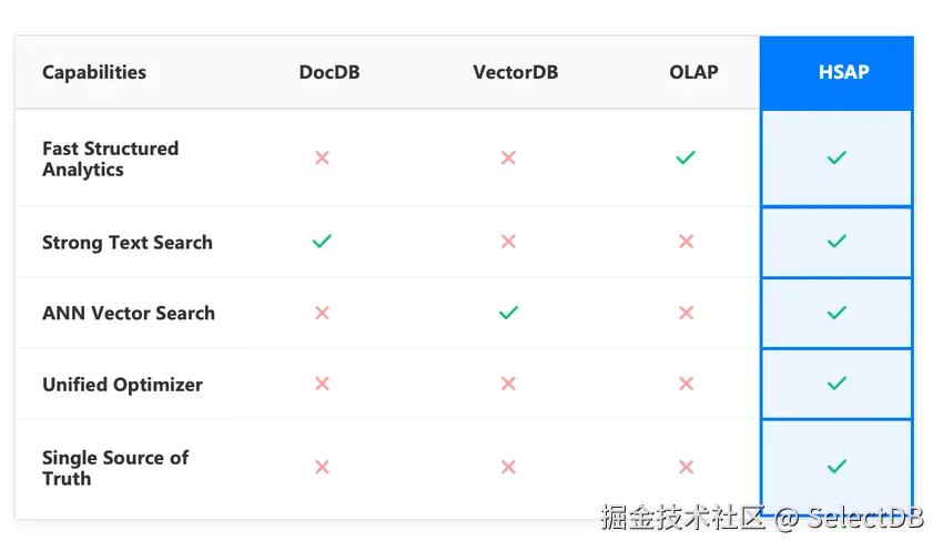 相对而言,Hybrid Search and Analytics Processing(HSAP) 是当下更优的解决方案。它能在同一引擎中同时处理结构化分析、全文搜索和向量搜索,并通过统一优化器调度协同执行。