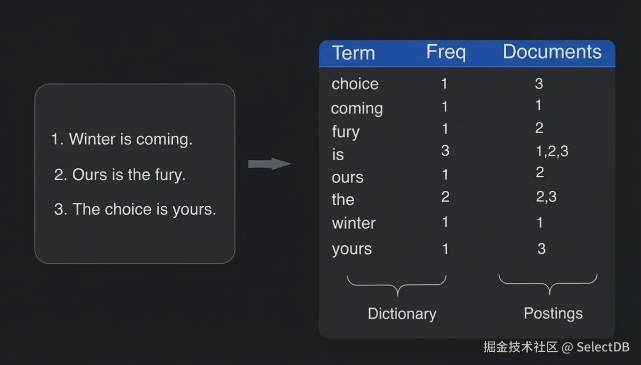 倒排索引基本原理是将文本拆分成词项(Term),并记录每个词项出现的文档。查询时无需逐行扫描,直接通过索引定位相关行号,将查询复杂度从 O(n) 下降到 O(log n) 级别。为了让搜索能力真正适配 AI Agent 的分析场景,Doris 对倒排索引进行了系统化的架构设计与工程优化。