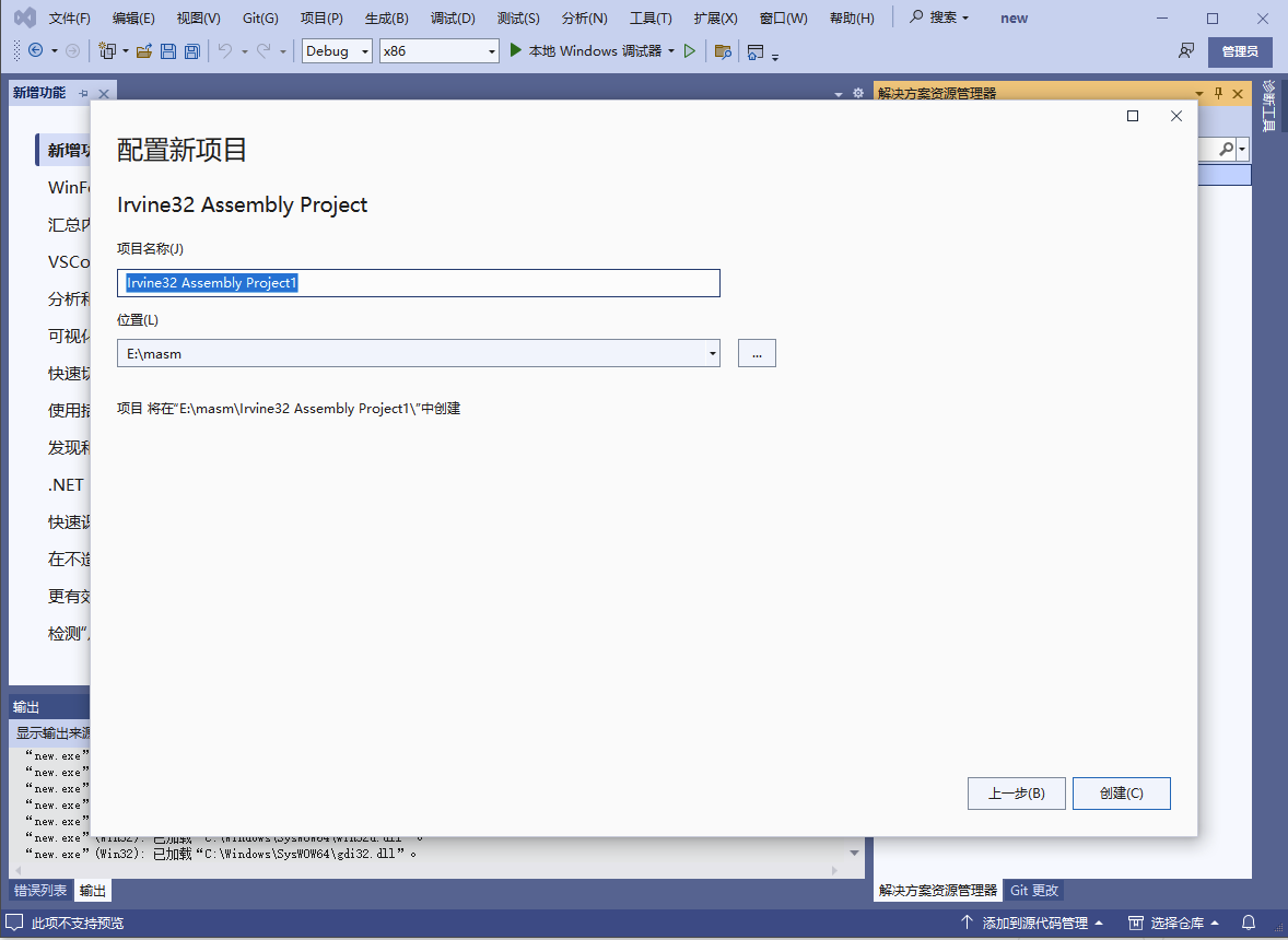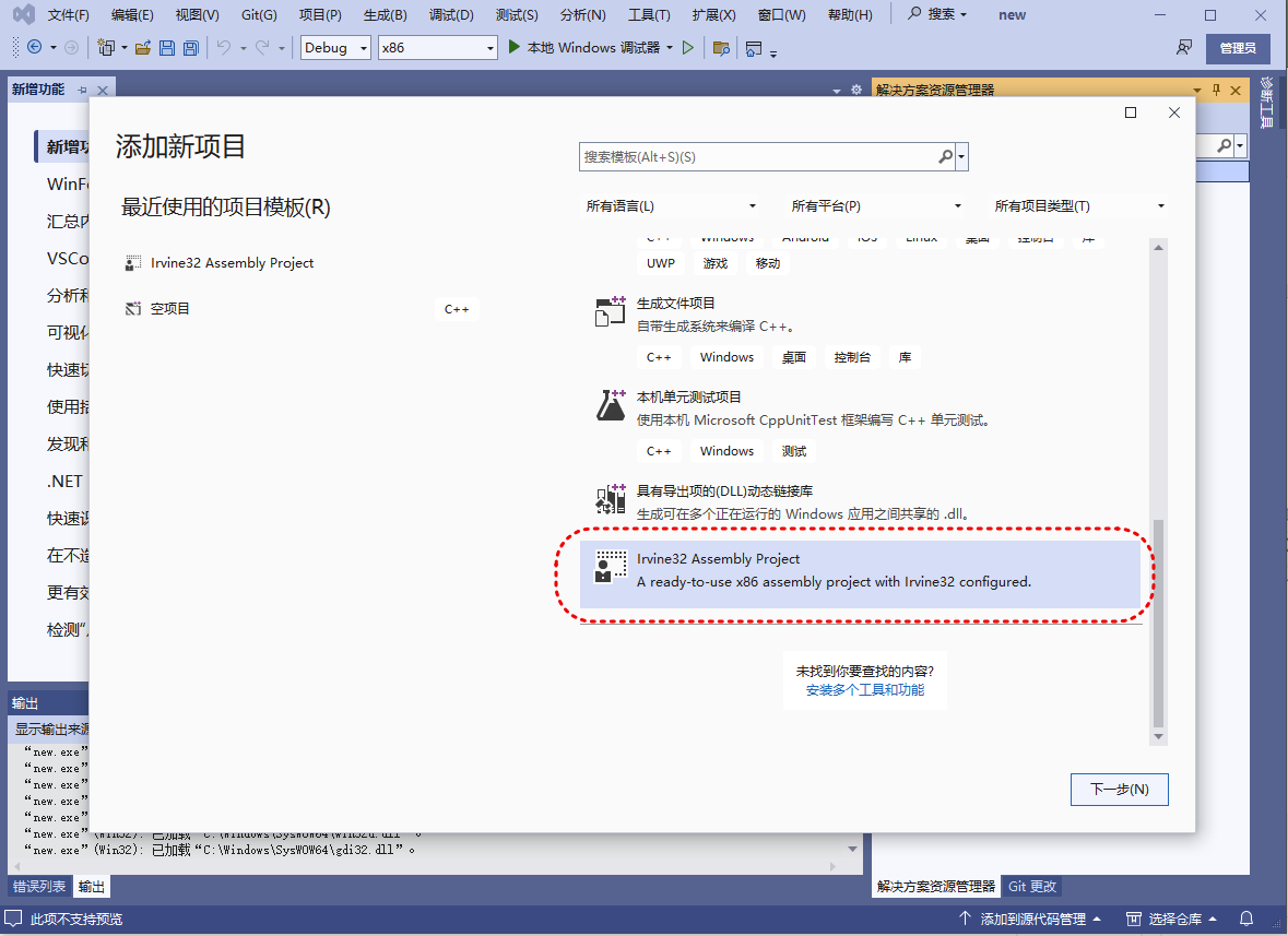 那么 ,下一步,我们就以此为模板,创建可复用的带Irvine32配置的项目,这样就不用每次新建项目后,还要依照前述方法一步又一步地进行各个属性配置,太麻烦了,本次就使用模板,一次性创建好。具体如下: