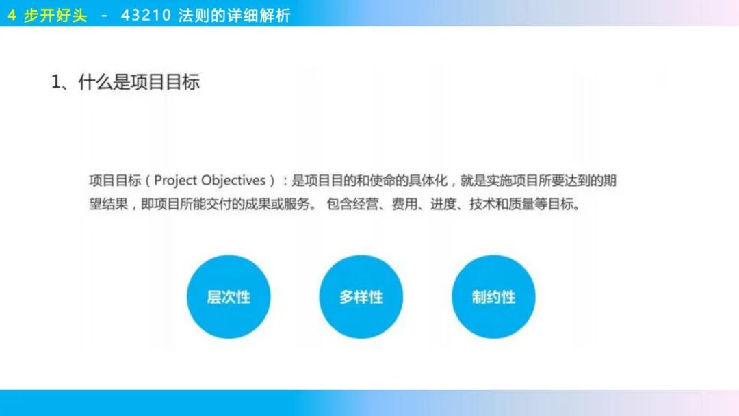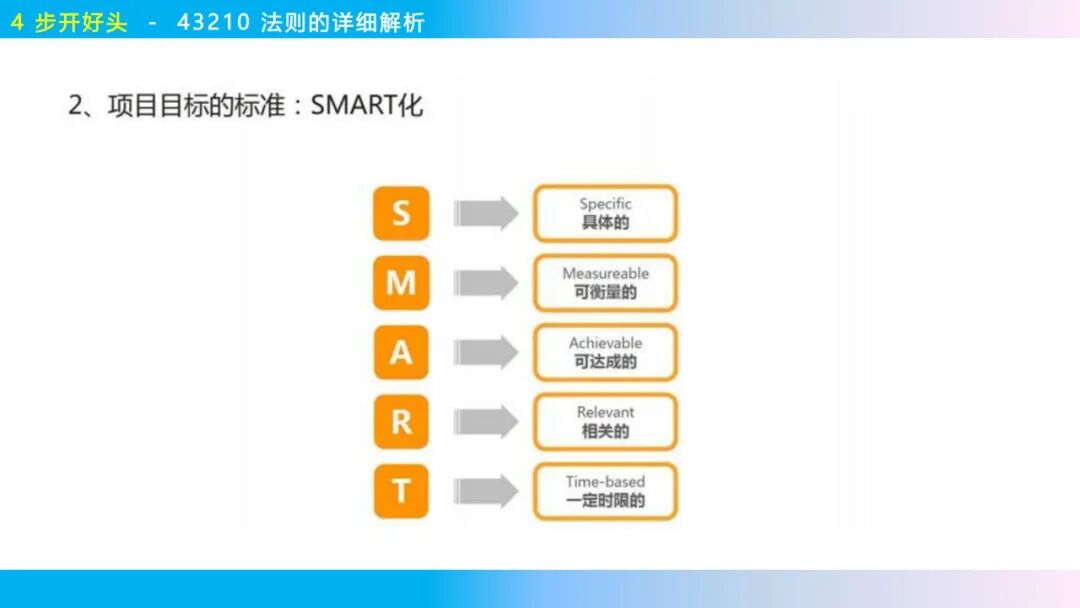 目标是价值的具象化落地,需遵循 SMART 原则制定。也就是说目标要具体,可用数据指标描述;要可衡量,有客观标准判断是否达成;要具备可达成性,同时带有一定挑战性;要和项目价值强相关;还要设定明确时限。比如项目目标可设定为 "3 个月内完成某通信模块优化,使设备运行稳定性提升 20%,研发成本控制在 50 万元内"。