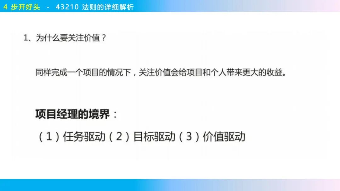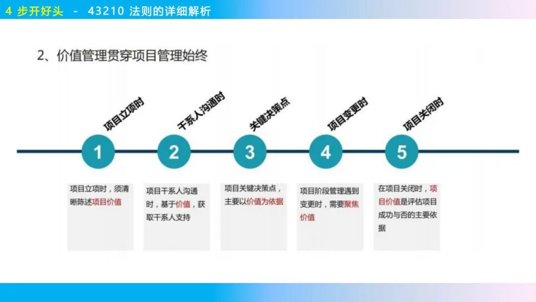 这是项目的核心原点,要明确项目的核心价值,像战略价值、商业收益、团队成长等都在其列。识别时需找到真正受益方,挖掘其核心痛点而非表面需求。比如客户提出要设备升级,背后可能是提升生产效率的需求,项目价值就围绕满足这一深层需求界定。且价值管理会贯穿项目全程,后续立项、沟通、决策等环节都要以价值为依据。