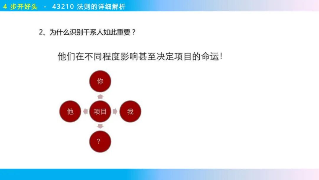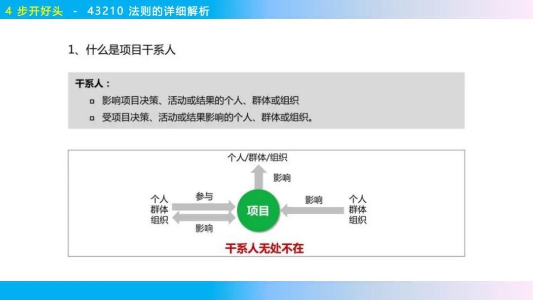 找出所有影响项目或受项目影响的个人、群体或组织,像客户、团队成员、供应商、公司管理层等都属于干系人。之后按干系人的影响力和利益相关性分类,制定差异化管理策略。例如对影响力大、利益相关度高的核心客户要重点对接,及时同步进度;对影响力小、关联度低的群体则做好定期简要告知即可。