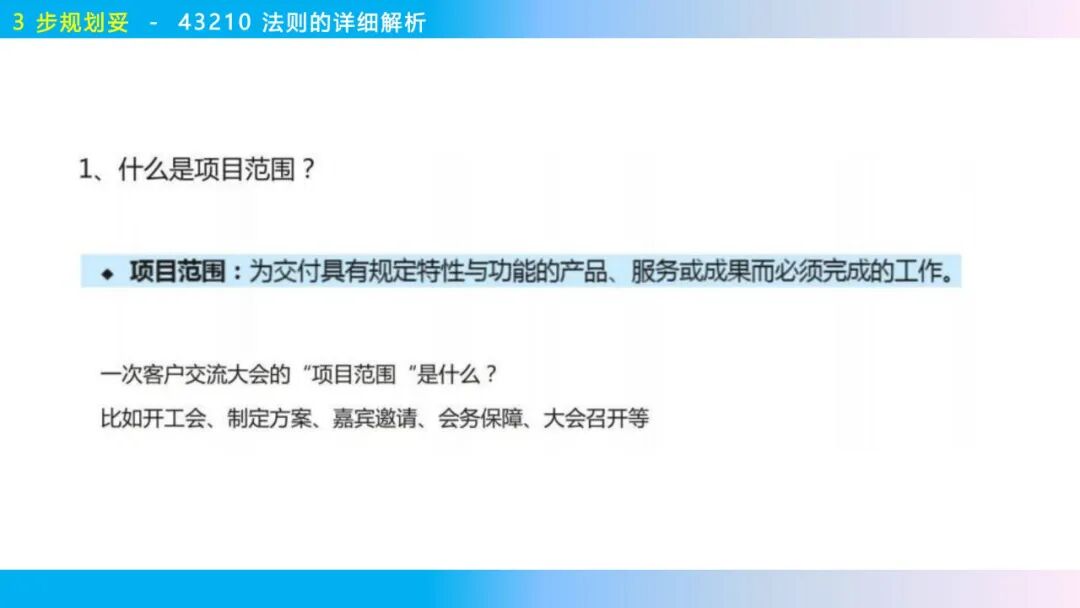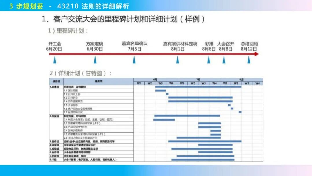 明确项目必须完成的工作边界,避免范围蔓延。通常会制作 WBS(工作分解结构),把整体项目 100% 拆分成小任务,要求单个任务周期不超 2 周,且每个任务都有明确的责任人与验收标准。比如客户交流大会项目,就可将范围划定为制定方案、嘉宾邀请、会务保障等核心工作。