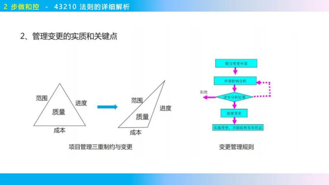 项目推进中需求、环境等变化很常见,这一步需按不同阶段做好差异化管控。早期要主动建立变更意识,合理的变更可灵活接纳;中期面对变更需全面评估其必要性,测算变更带来的成本增加、工期延误等代价,再决定是否推进;后期则需慎重对待变更,若变更影响过大,可考虑评估是否要新启动专项项目来落地。比如客户临时提出产品功能调整,需先核算研发成本与周期影响,再结合项目价值判断是否执行变更,避免盲目调整导致项目混乱。