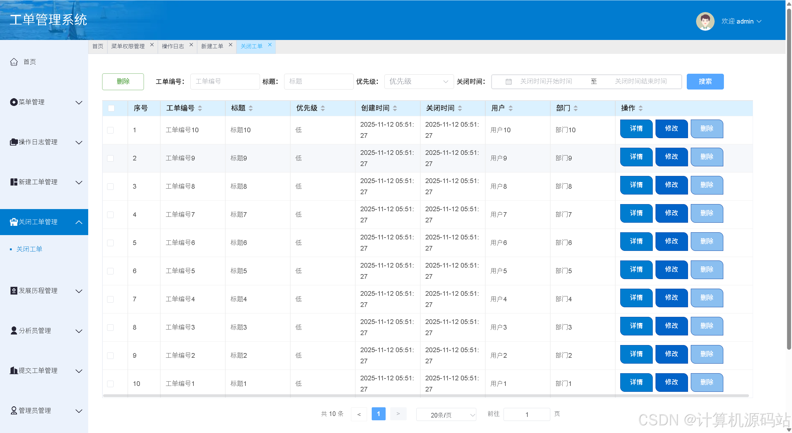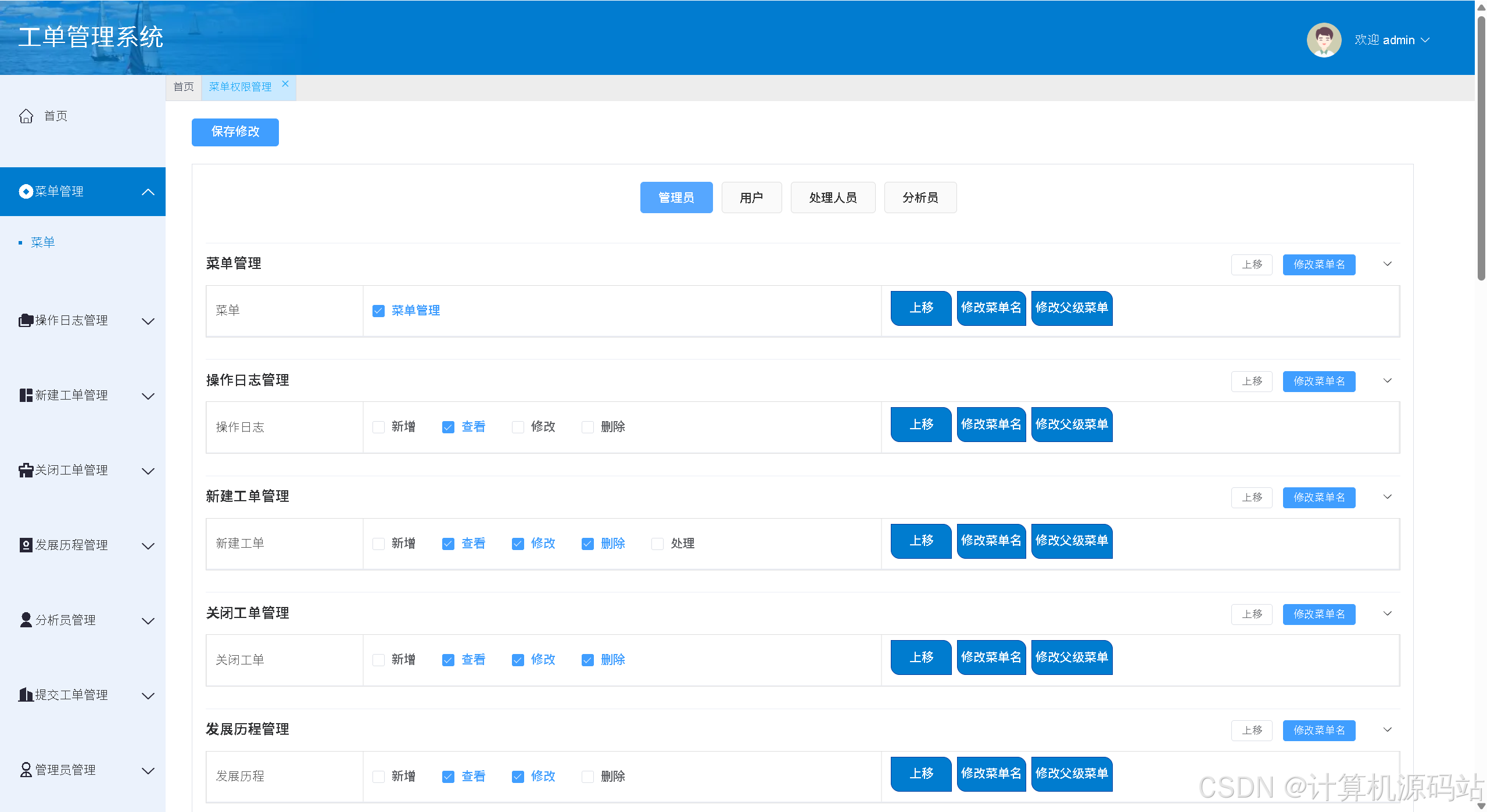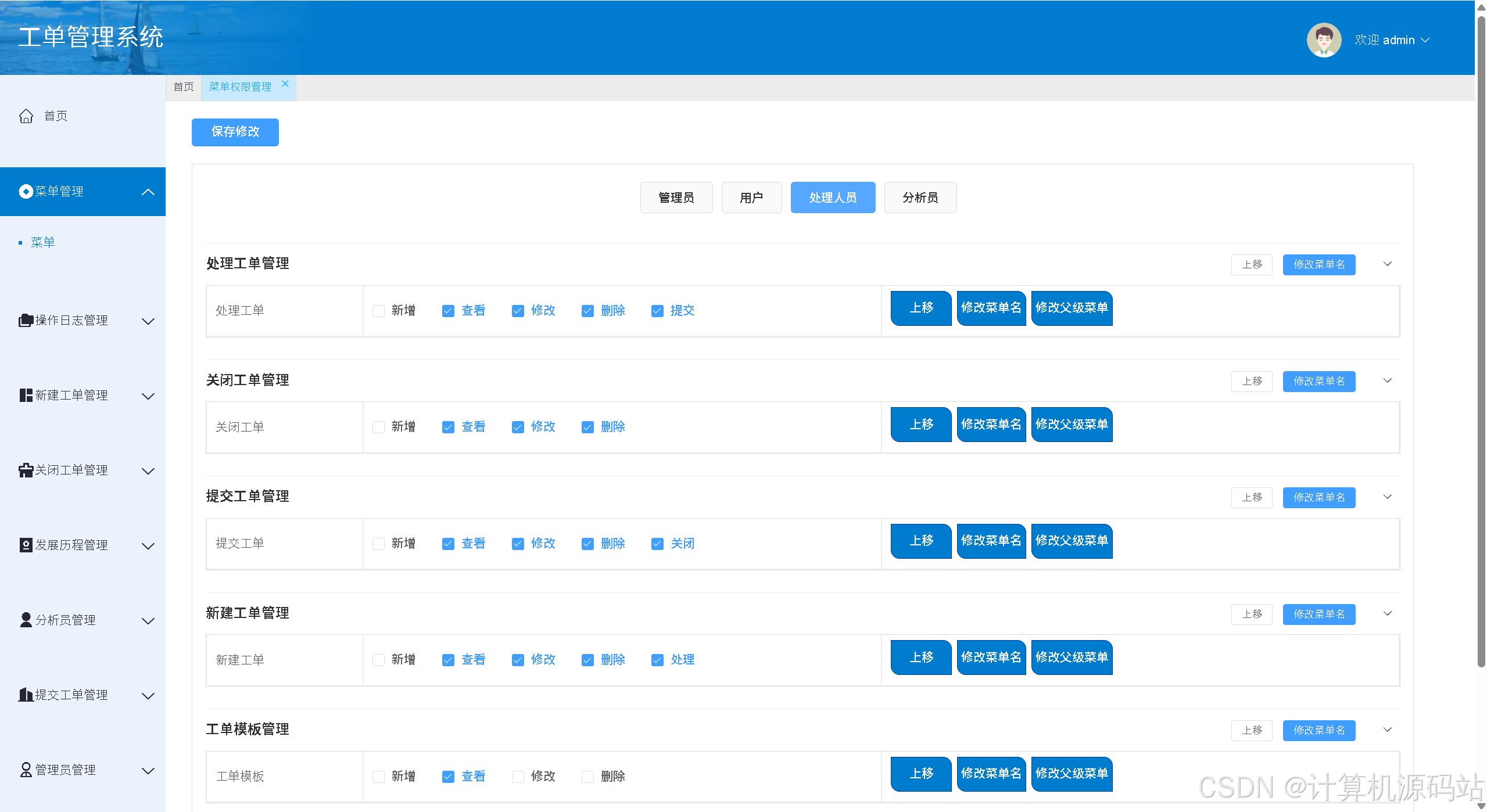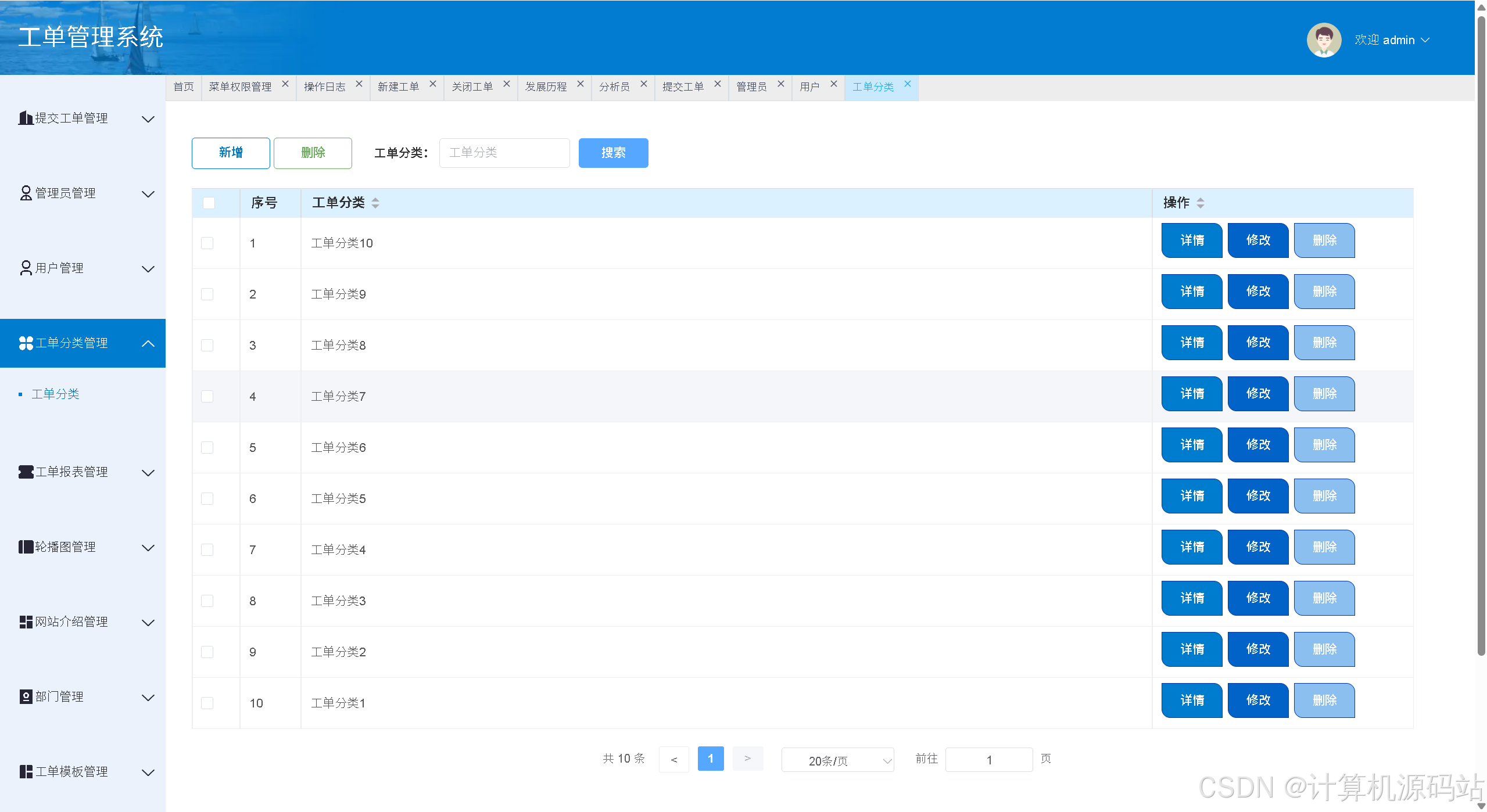- 工单管理、分类管理、工单模板管理、工单报表导出、部门管理、管理员管理、用户管理、轮播图管理、公告管理、员工管理、日志管理、菜单管理