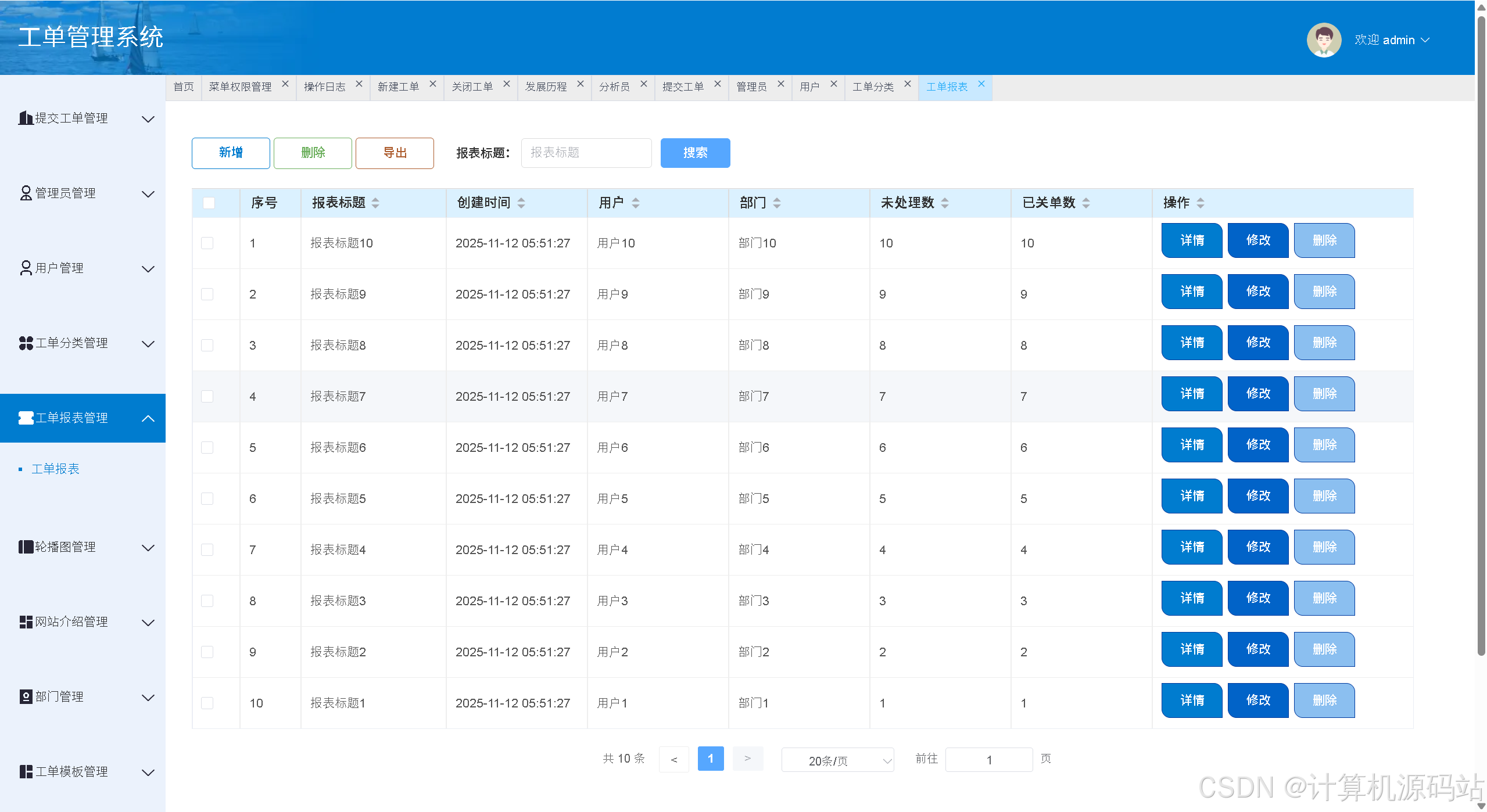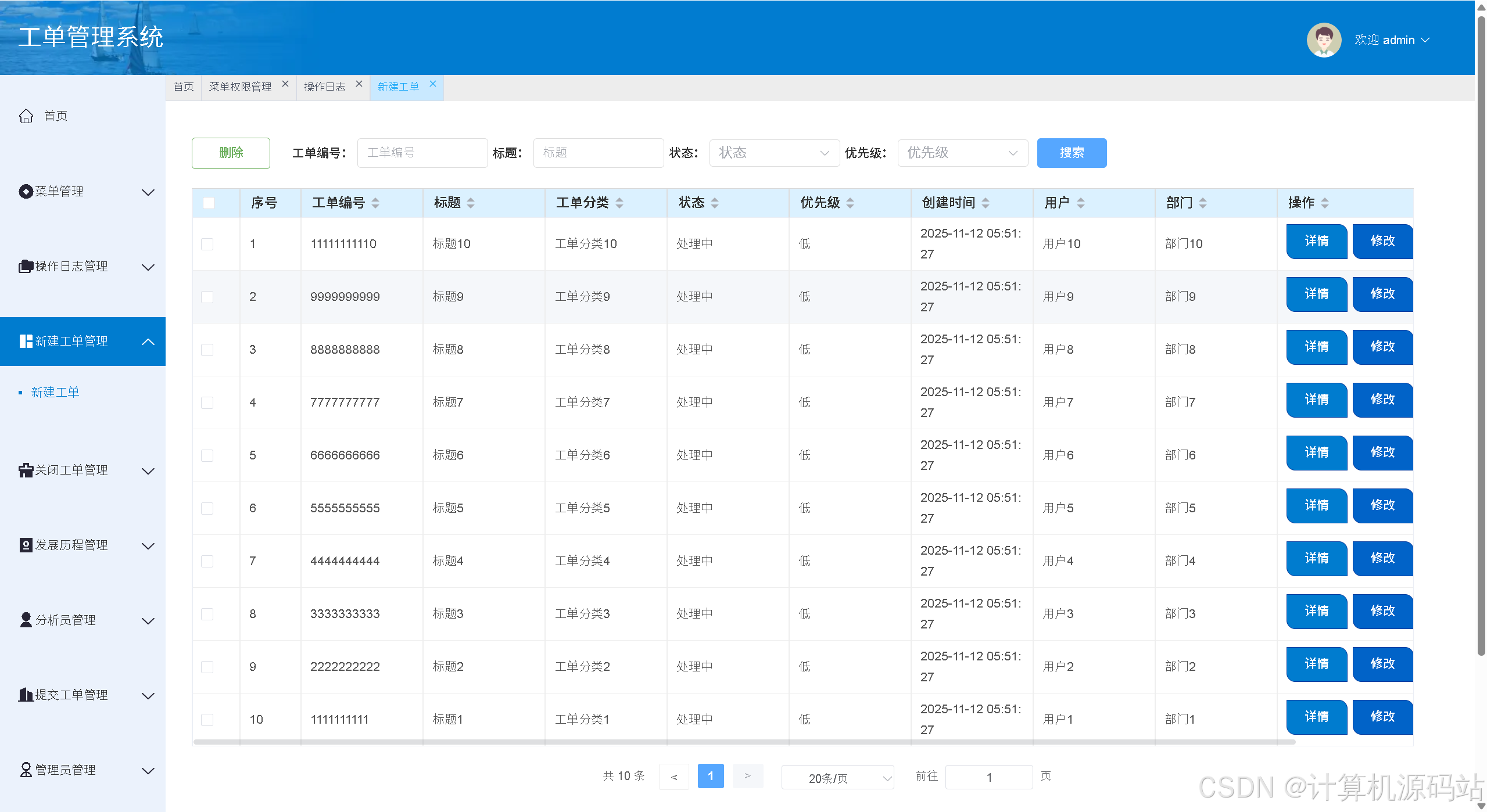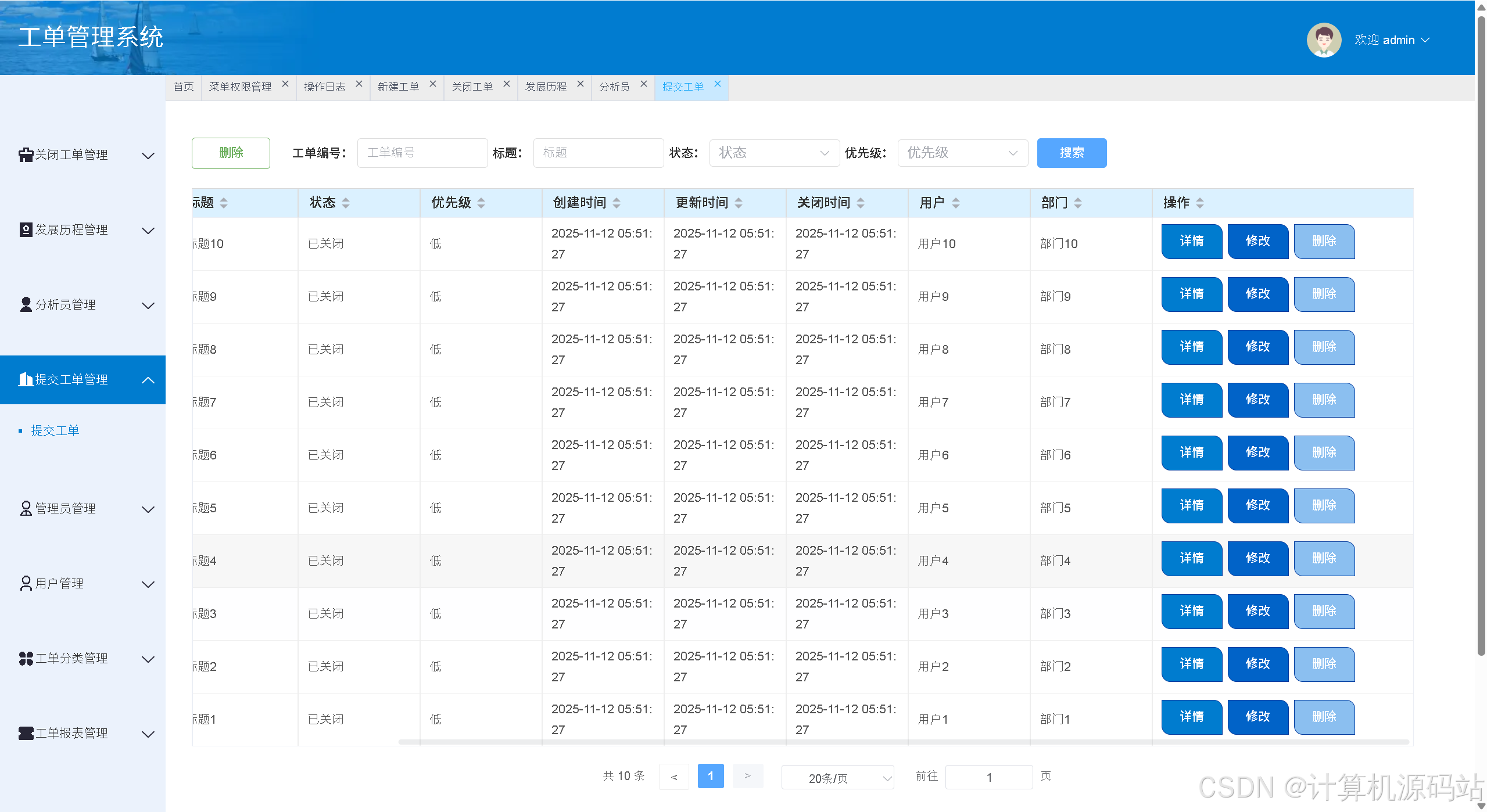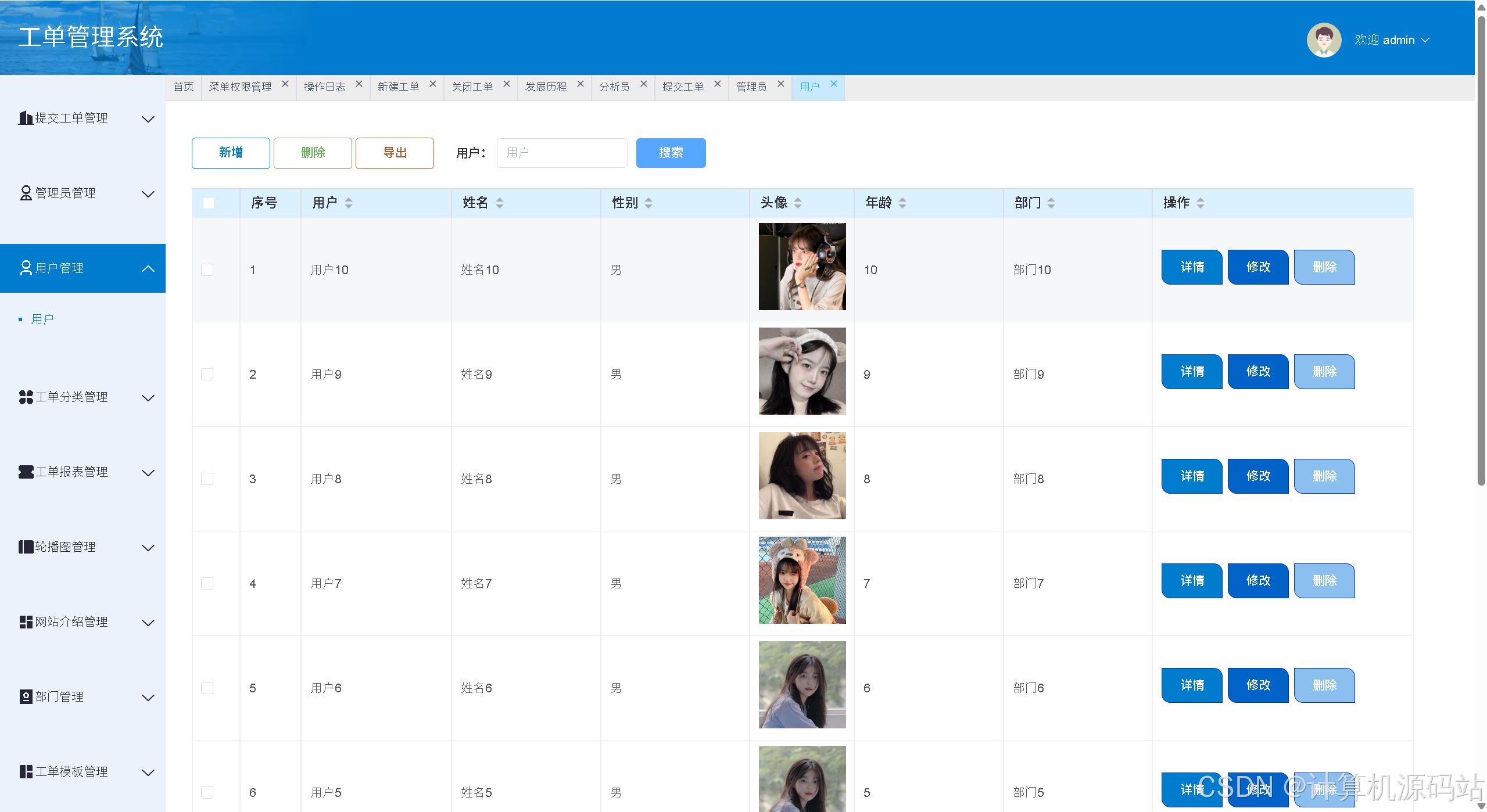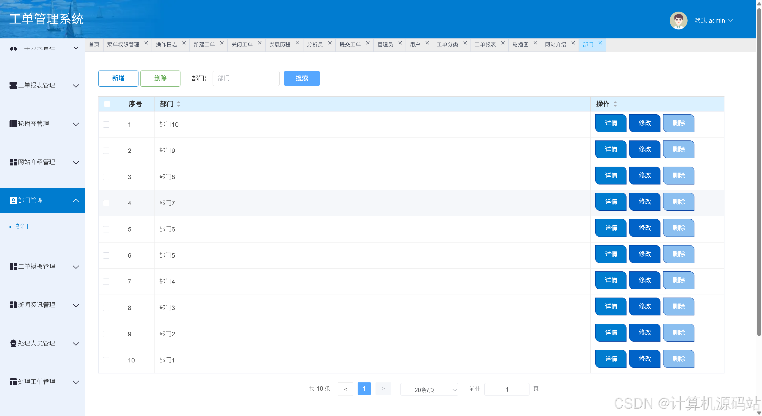 - 工单管理、分类管理、工单模板管理、工单报表导出、部门管理、管理员管理、用户管理、轮播图管理、公告管理、员工管理、日志管理、菜单管理