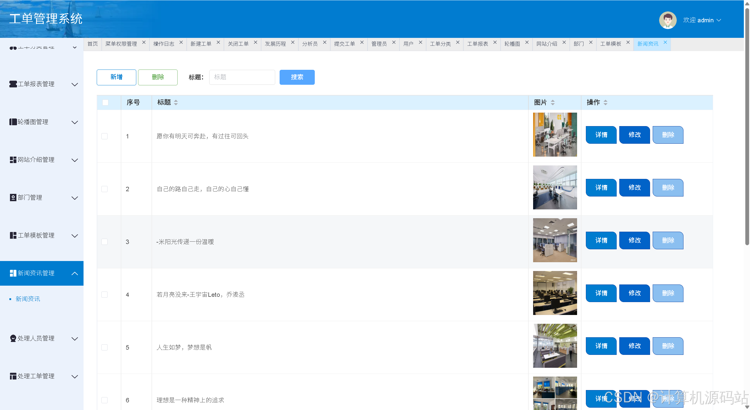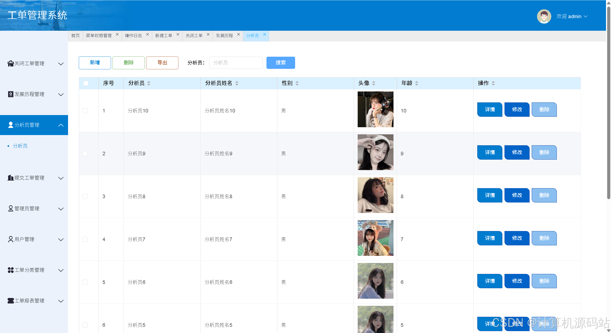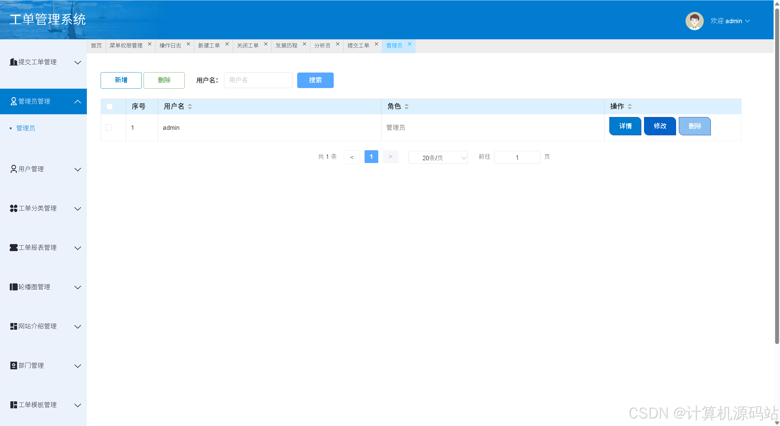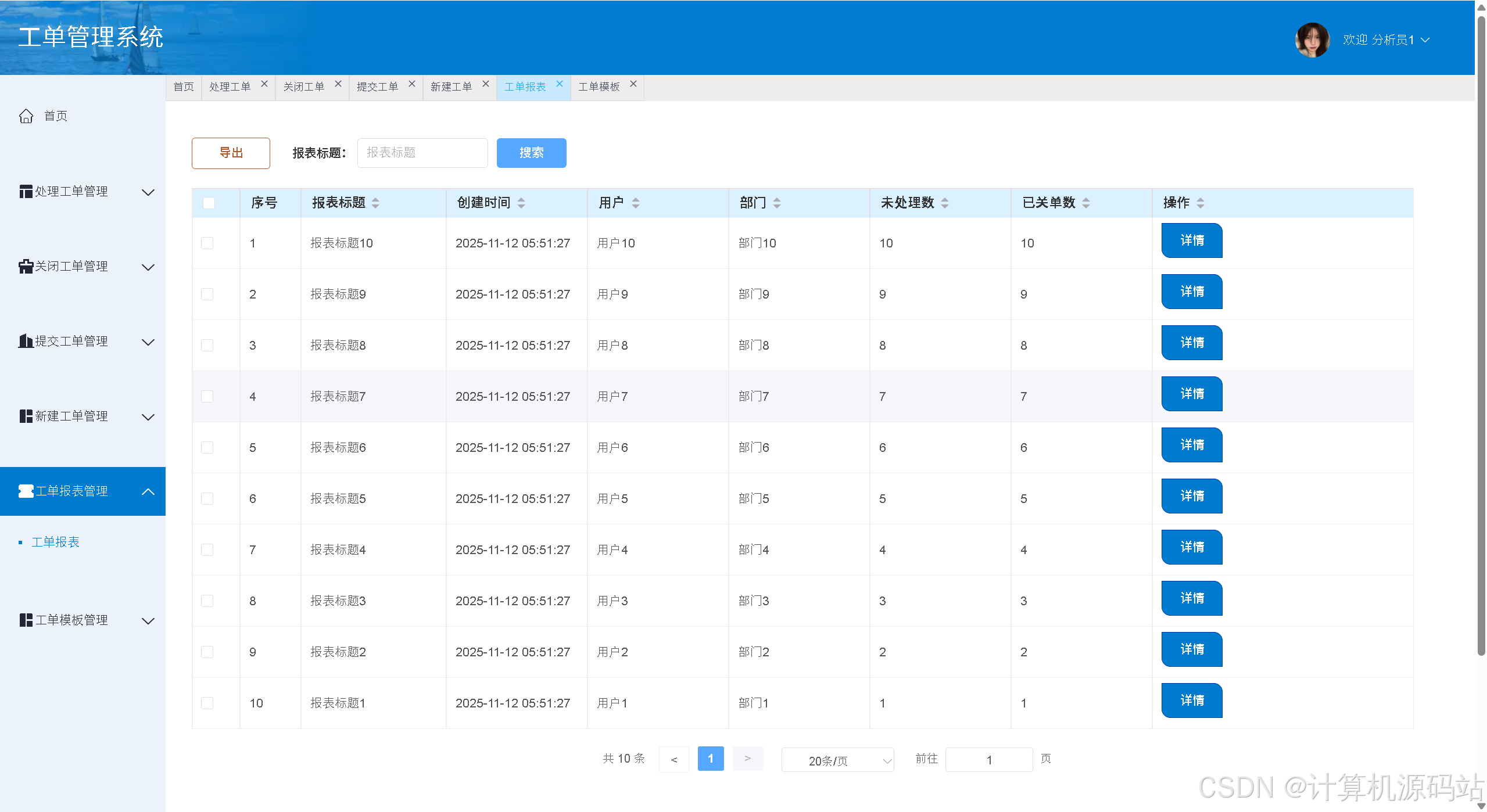 - 工单管理、分类管理、工单模板管理、工单报表导出、部门管理、管理员管理、用户管理、轮播图管理、公告管理、员工管理、日志管理、菜单管理