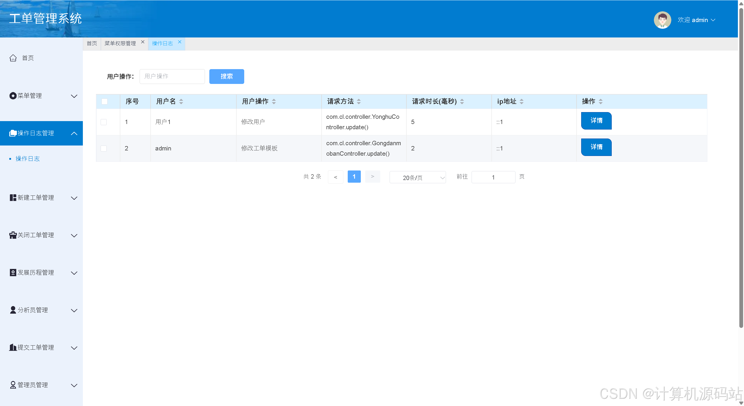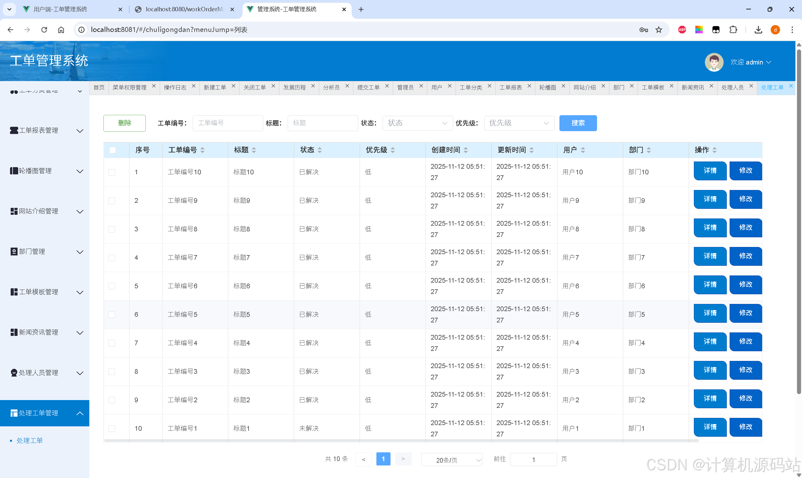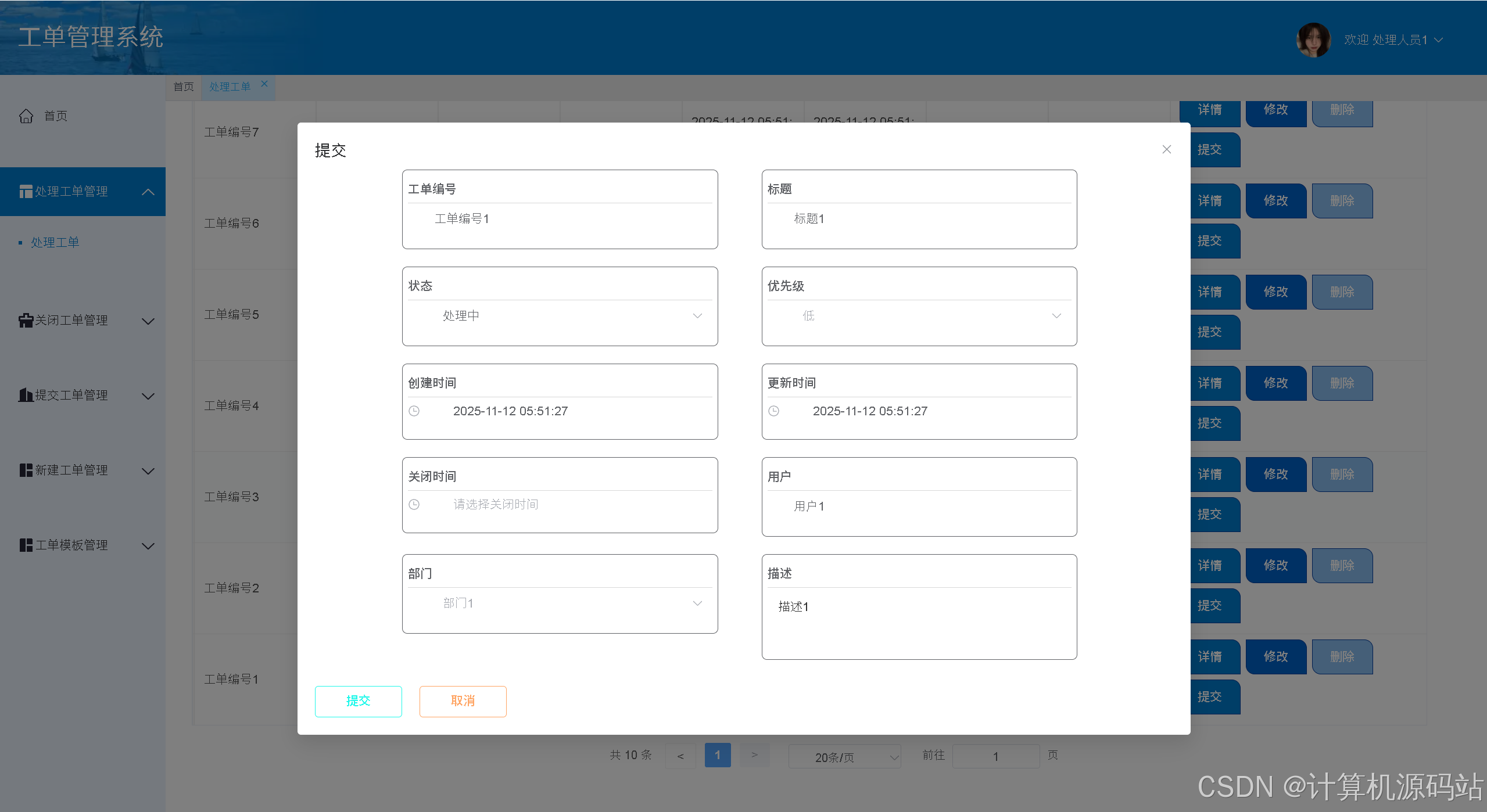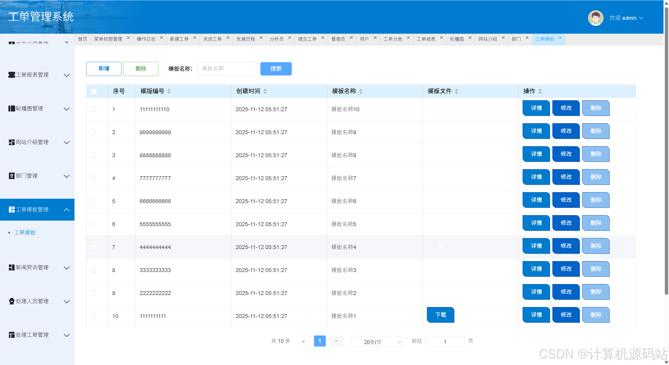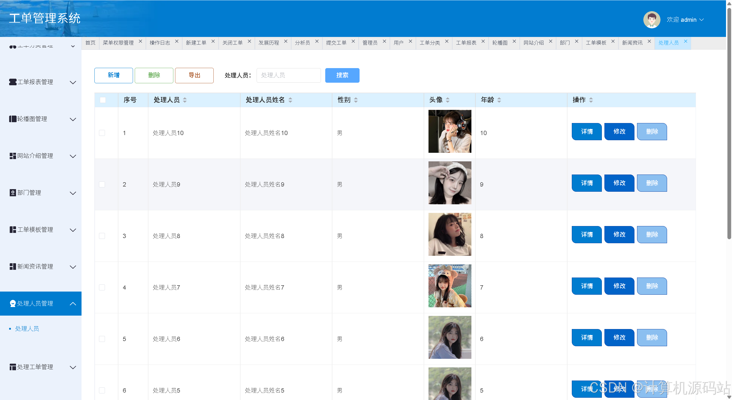 - 工单管理、分类管理、工单模板管理、工单报表导出、部门管理、管理员管理、用户管理、轮播图管理、公告管理、员工管理、日志管理、菜单管理