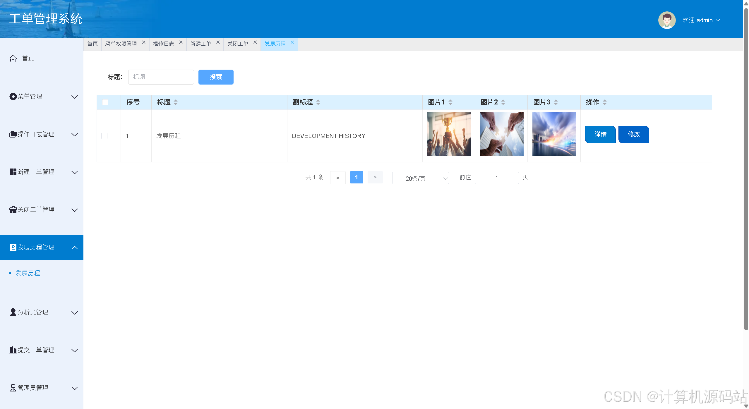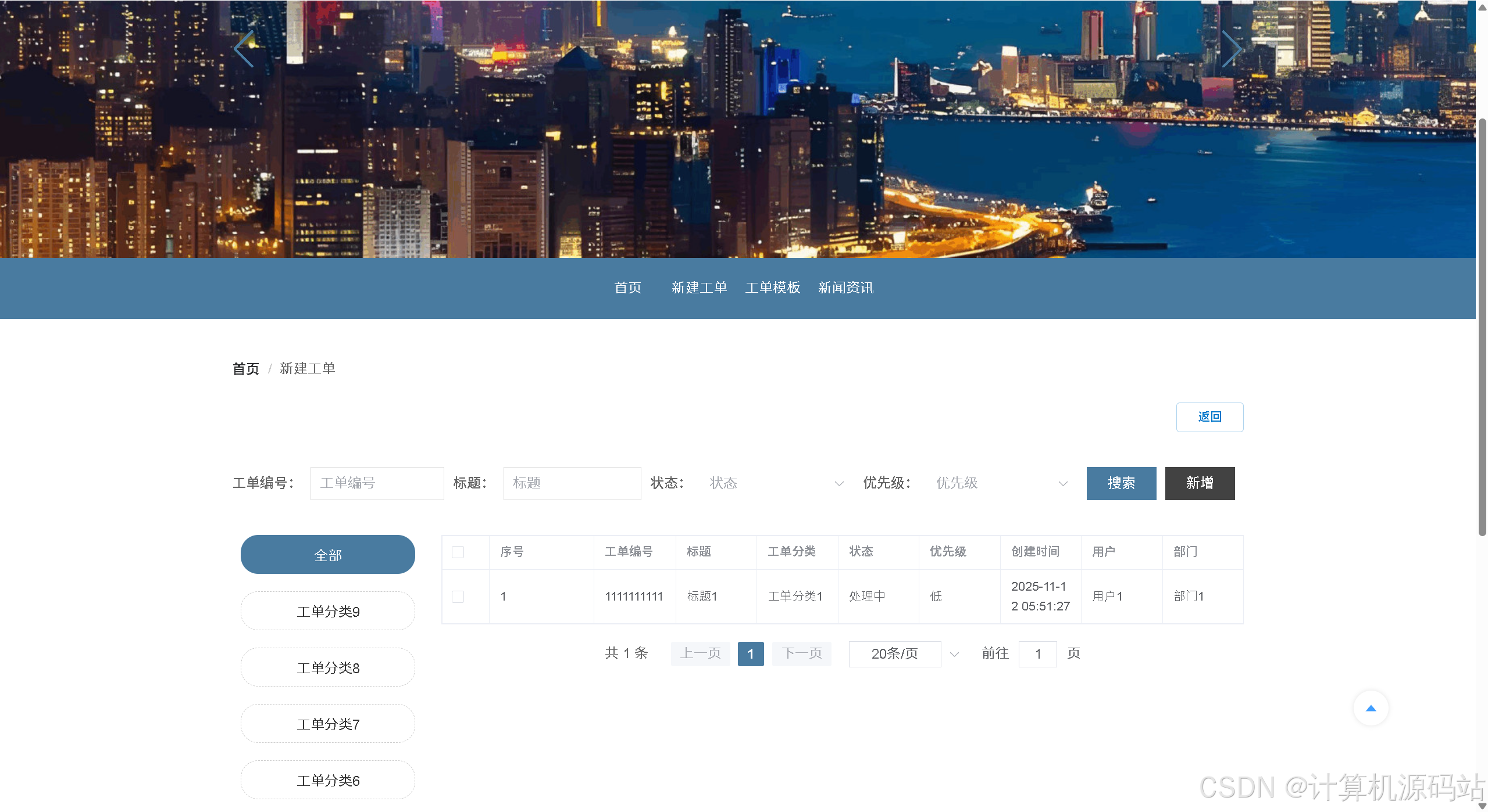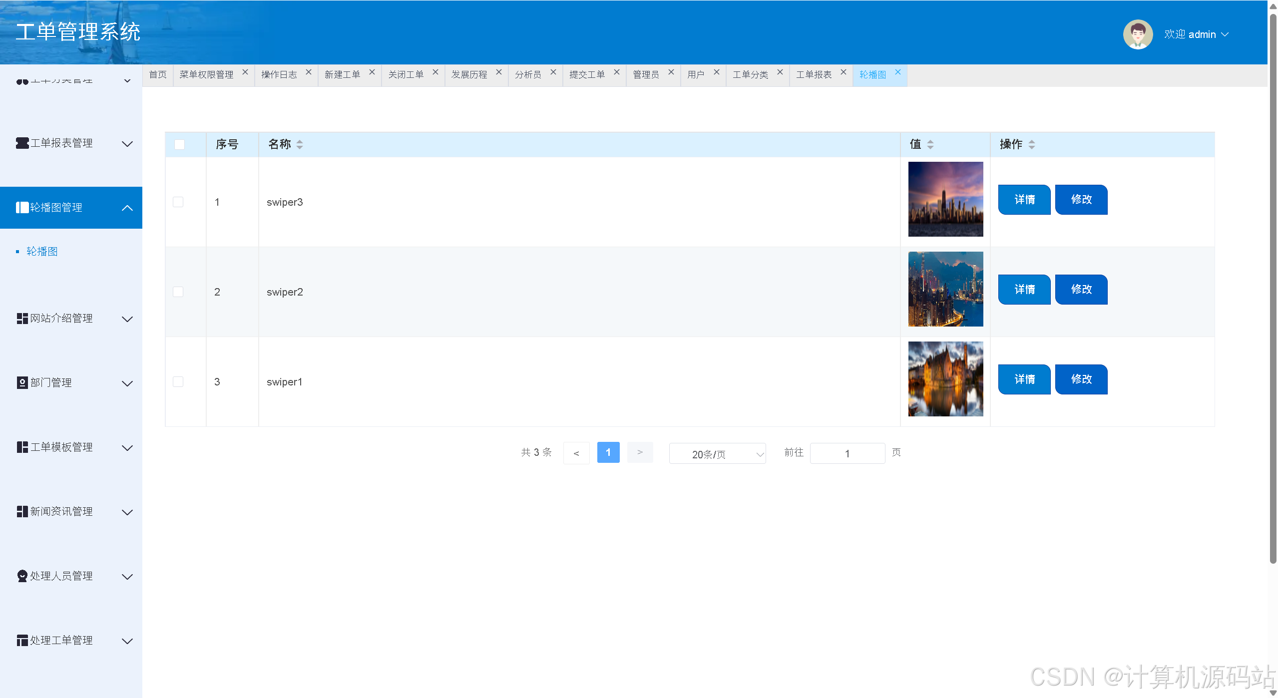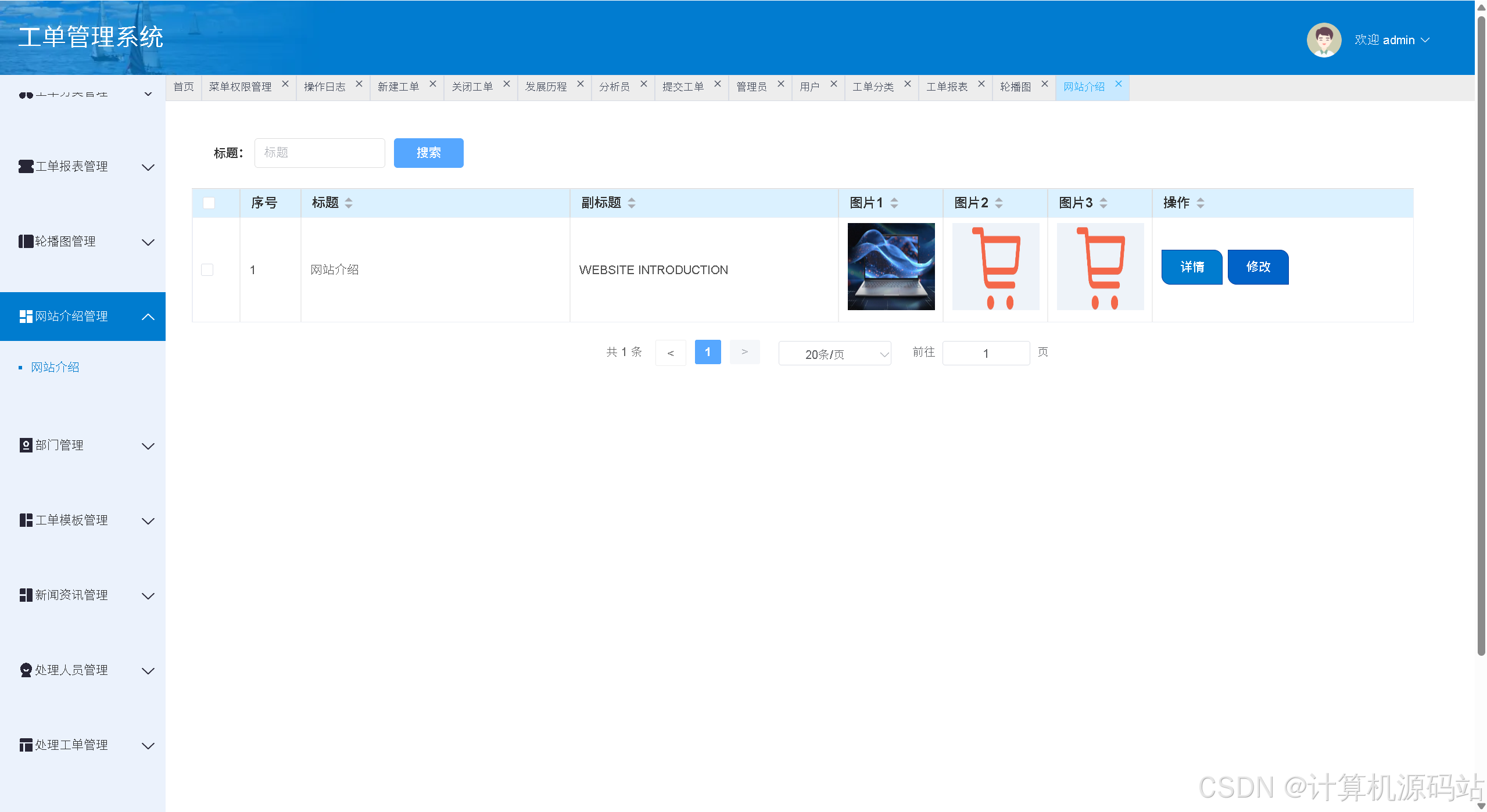 - 工单管理、分类管理、工单模板管理、工单报表导出、部门管理、管理员管理、用户管理、轮播图管理、公告管理、员工管理、日志管理、菜单管理