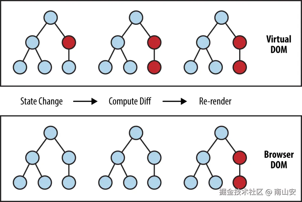 Virtual DOM 原理:React 不直接操作真实 DOM,而是维护一个虚拟 DOM 树。状态变了,计算新旧差异(diff 算法),只 patch 必要的部分。高效!