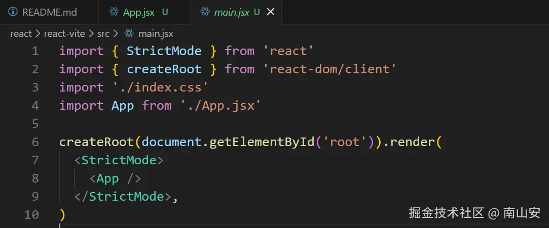 原理:React 19 用 createRoot 挂载根组件到 DOM 的 #root 上。以前有 StrictMode 会渲染两次帮你查 bug,现在可以注释掉。Vite 会自动编译 Stylus 为 CSS,超级方便。