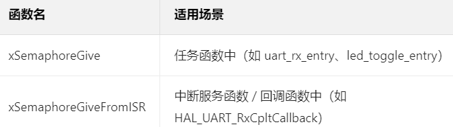 xSemaphoreGiveFromISR(uart_rx_sem,&taskWoken); // 中断中释放信号量(同步任务)