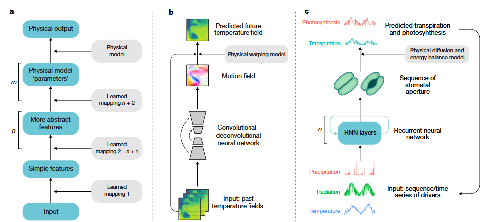 用机器学习模型替换"物理"子模型 (圆圈2)。如果子模型的公式是半经验性的,其功能形式没有太多理论基础(例如生物过程),则可以在有足够观测数据的情况下用机器学习模型替换该子模型。这会产生一个混合模型,结合了物理建模(理论基础、可解释部分)的优势和机器学习(数据适应性)的优势。例如,我们可以将植物中水运输的扩散物理方程与机器学习结合起来,用于水运输导管生物调节的理解不充分的部分。这将产生一个更"物理"的模型,遵循质量和能量守恒定律,但其生物调节部分是从数据中学习的。