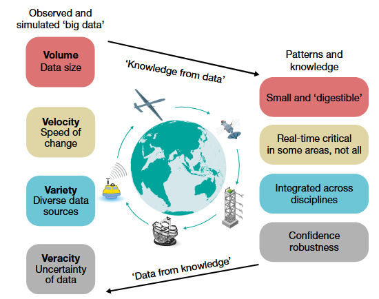 人类一直努力预测和理解世界,而提高预测能力 在不同环境中(如天气、疾病或金融市场)都带来了竞争优势。然而,预测工具随着时间的推移发生了巨大变化,从古希腊的哲学推理到中世纪非科学方法如占卜,再到现代科学论述,其中包括基于统计和物理关系的假设检验、理论发展和计算机建模,即定律。地球科学领域的一个成功案例是天气预测 ,通过更好的理论、增强的计算能力和建立的观测系统的整合,天气预测得到了很大改善,这些系统允许将大量数据同化到模拟系统中。然而,我们只能在数天 的时间尺度上准确预测天气的演变,而不是数月。季节气象预测、预测极端事件如洪水或火灾以及长期气候预测仍然是重大挑战。对于生物圈动态的预测,情况尤为如此,生物圈主要由生物介导的过程(如生长或繁殖)控制,受到火灾和山体滑坡等看似随机的干扰的强烈影响。在过去几十年里,这些预测问题没有取得太多进展。与此同时,大量地球系统数据已经可用,存储容量已经远远超出了数十个PB,并且每天的传输速率迅速增加,超过了数百TB。这些数据来自于大量传感器测量的状态、通量和强度或时间/空间集成变量,代表了十五个以上的时间和空间数量级。它们包括从地球上方几米到数百公里的遥感观测,以及表面和大气层下(越来越多来自自动传感器)的原位观测,其中许多观测还进一步得到公民科学观测的补充。模型模拟输出增加了这种数据洪流;用于定期气候评估的气候模型比较项目(CMIP-5)数据集大小超过3PB,而下一代CMIP-6的估计大小将达到30PB。模型数据与观测数据具有许多相似的挑战和统计特性,包括许多形式的不确定性。总之,地球系统数据是"大数据 "的四个"V"中的典型代表:容量、速度、多样性和准确性。一个关键挑战是从这些大数据中提取可解释的信息和知识,可能几乎是实时的,并在各个学科之间进行整合。