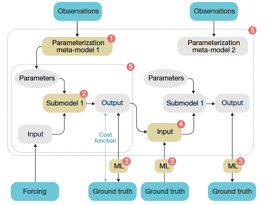 约束子模型 (圆圈4)。可以用机器学习算法的输出驱动一个子模型,而不是另一个(可能有偏差的)子模型的离线模拟。这有助于将感兴趣子模块的模型误差与耦合子模块的误差分离开来,从而简化和减少模型参数校准或观测系统状态变量同化中的偏差和不确定性。
