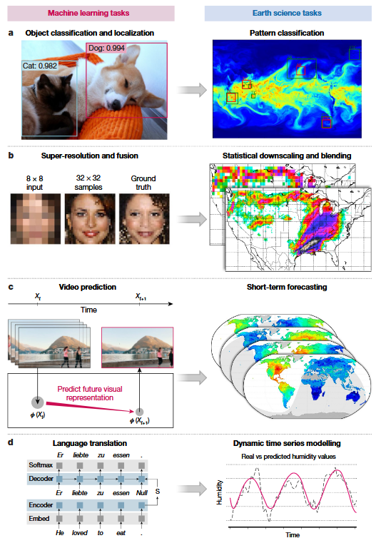 图2|典型深度学习应用的四个示例(左图)及其可应用于的地球科学问题(右图)。a,图像中的对象识别与使用气候模拟数据上的统一卷积神经网络对极端天气模式进行分类相关联。b,超分辨率应用涉及气候模型输出的统计缩减。c,视频预测类似于地球系统变量的短期预测。右图由马克斯·普朗克生物地球化学研究所的 Sujan Koirala 和 Paul Bodesheim 提供。d,语言翻译链接到动态时间序列建模。