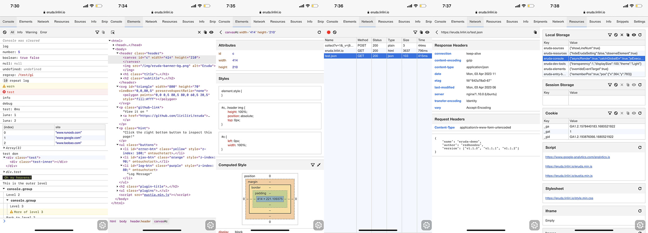 - 插件化:Eruda采用插件化的架构,支持多种插件扩展。开发者可以根据自己的需求选择不同的插件,扩展调试功能。例如,有专门用于查看Cookie信息的插件、用于查看本地存储的插件等。