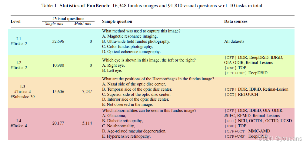 表1. FunBench的统计数据:共计10个任务,包含16,348张视网膜图像和91,810个视觉问题。