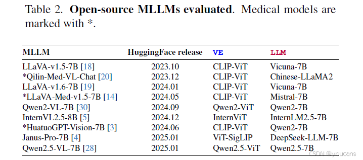 表2. 评估的开源MLLMs。医学模型用"*"符号标记*