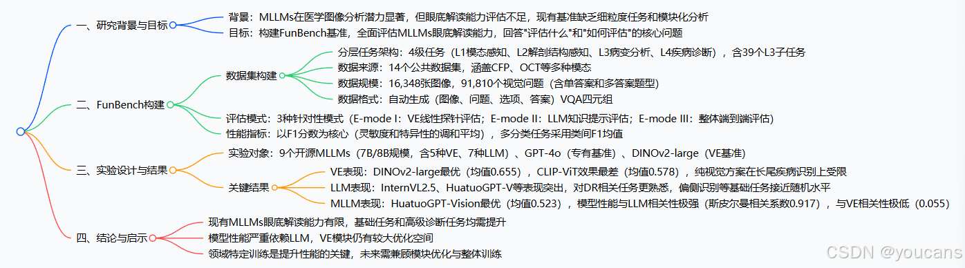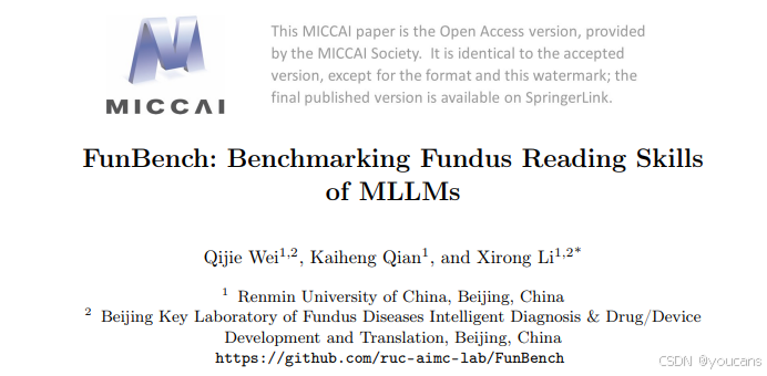 2025 年 Qijie Wei 等在 MICCAI 2025 发表论文 "FunBench: Benchmarking Fundus Reading Skills of MLLMs(FunBench:评估多模态大语言模型的眼底影像解读能力)"。