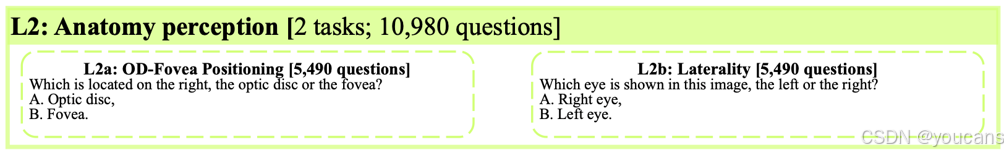 视盘与黄斑是视网膜的两大核心解剖结构。其视觉特征相对明确:在彩色眼底图像中,视盘通常呈现为明亮的椭圆形区域,而黄斑则位于视盘颞侧最暗区域的中心。此外,眼底图像的左右眼属性可根据视盘在图像中的相对位置进行判定。因此,具备L2能力的模型应能判断视盘-黄斑相对位置关系(L2a)并识别左右眼(L2b)。