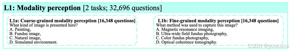 具备L1能力的模型应能识别生成眼底图像所采用的成像技术。基础场景下,模型需从"自然图像""绘画""遥感"等多选项中识别"眼底图像"。进阶场景则需区分不同眼底成像模态(如彩色眼底照相、光学相干断层扫描、超广角眼底照相)及其他医学影像(如X光、磁共振成像)。我们将这两种设定分别命名为粗粒度模态感知(L1a)与细粒度模态感知(L1b)。