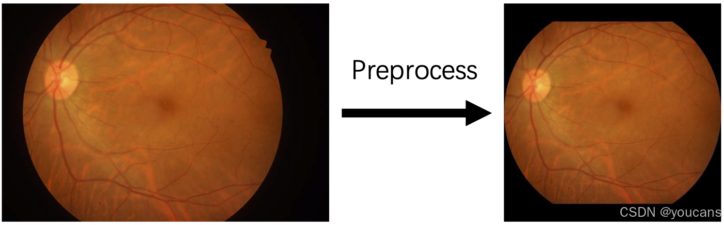 - 对于彩色眼底照相图像:裁剪视网膜区域并确保图像为正方形