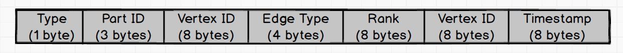 Type:1 个字节,用来表示 key 的类型,当前的类型有 data, index, system 等。Part ID:3 个字节,用来表示数据分片 Partition,此字段主要用于 Partition 重新分布(通过 BALANCE 命令)时方便根据前缀扫描整个 Partition 数据Vertex ID:8 个字节, 出边里面用来表示源点的 ID, 入边里面表示目标点的 ID。Edge Type:4 个字节, 用来表示这条边的类型,如果大于 0 表示出边,小于 0 表示入边。Rank:8 个字节,用来处理同一种类型的边存在多条的情况。用户可以根据自己的需求进行设置,这个字段可存放交易时间、交易流水号、或某个排序权重(比如,定义一个 edge type "转账",用户 A 可能多次转账给 B, 所以 Nebula 又增加了一个 Rank 字段来做区分,表示 A 到 B 之间多次转账记录。)Vertex ID:8 个字节,出边里面用来表示目标点的 ID, 入边里面表示源点的 ID。Timestamp:8 个字节,对用户不可见,未来实现分布式做事务的时候使用。