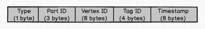 Type:1 个字节,用来表示 key 类型,当前的类型有 data, index, system 等Part ID:3 个字节,用来表示数据分片 Partition,此字段主要用于 Partition 重新分布(balance) 时方便根据前缀扫描整个 Partition 数据Vertex ID:8 个字节, 用来表示点的 IDTag ID:4 个字节, 用来表示关联的某个 tagTimestamp:8 个字节,对用户不可见,未来实现分布式事务(MVCC)时使用